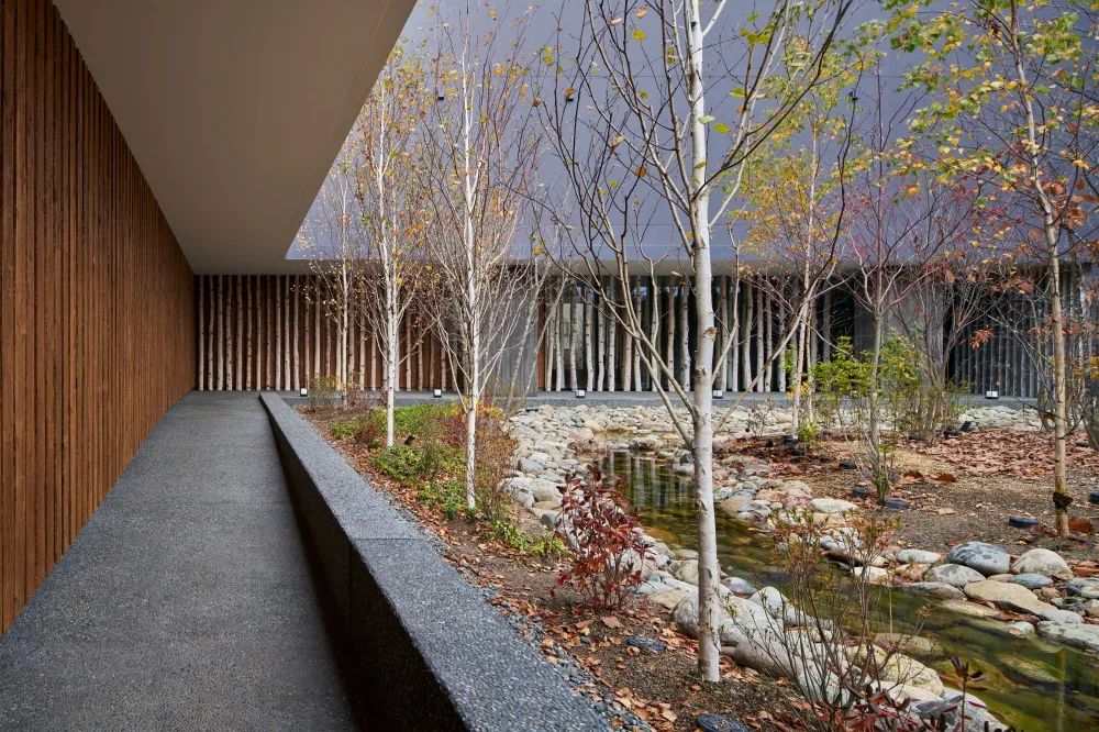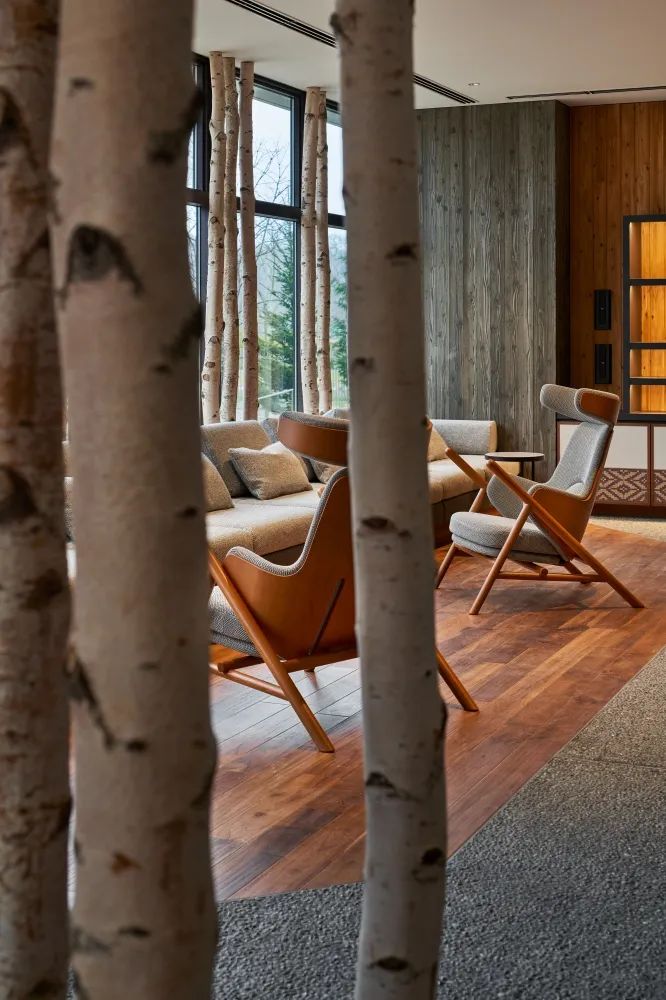 白樺樹的元素也被帶入了室內。從接待台到休息室、其間的連接廊道,均可以看見白樺樹自然而挺拔的身影。