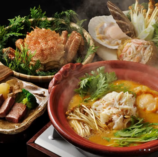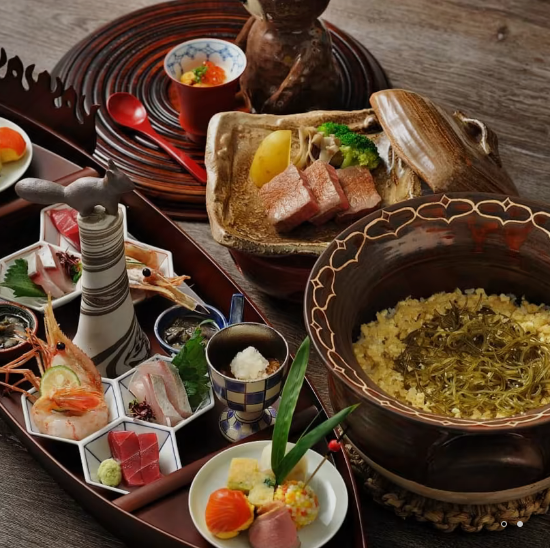 晚餐是北海道特有的毛蟹、干貝,搭配日式馬賽魚湯的豪華海鮮鍋。當季美味食材,盛放在以阿伊奴文化為靈感設計的器皿內,獻上令人賞心悅目的會席料理。