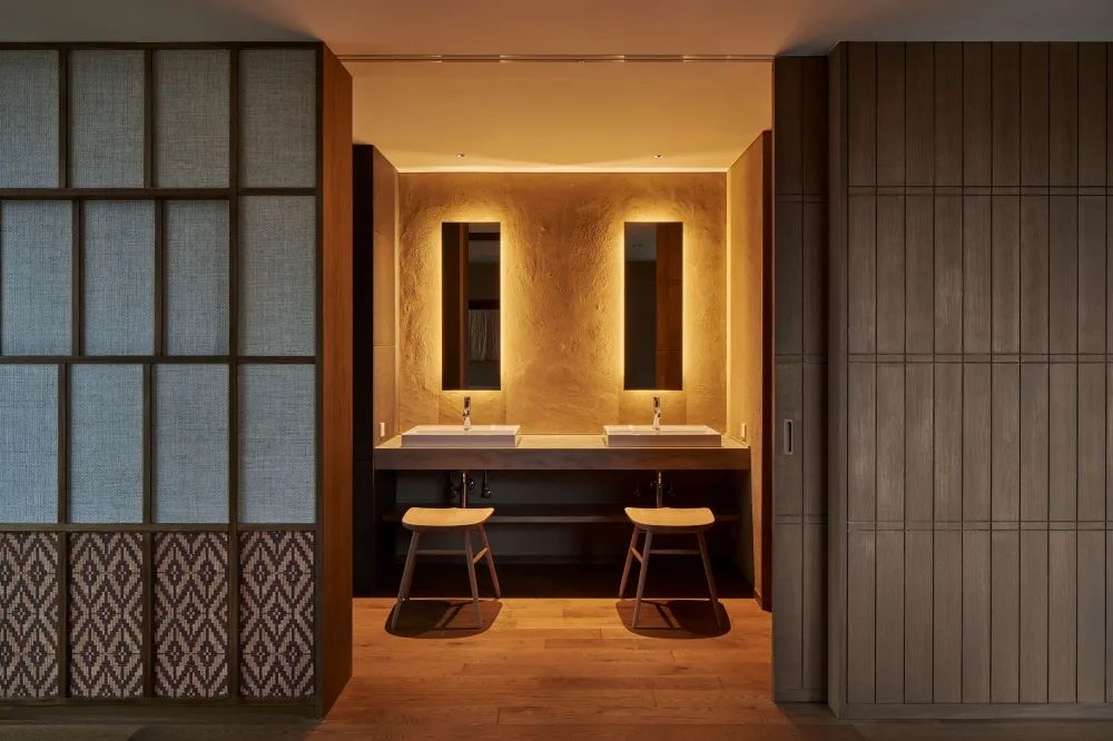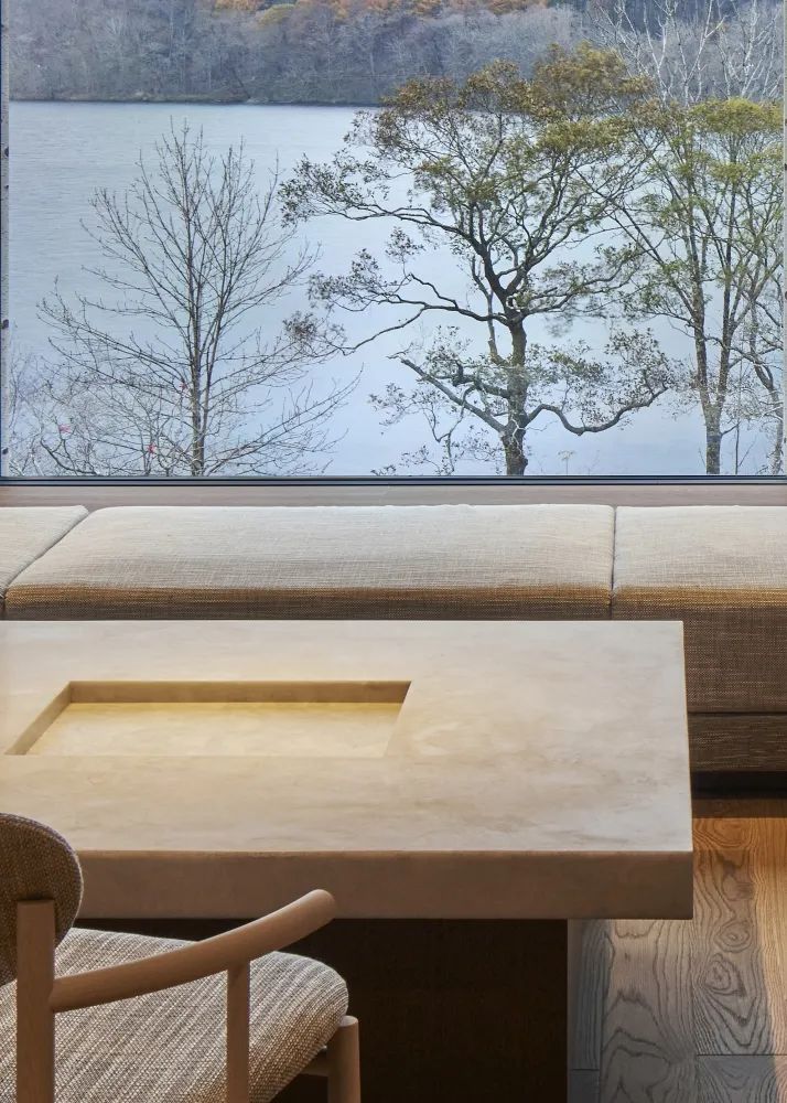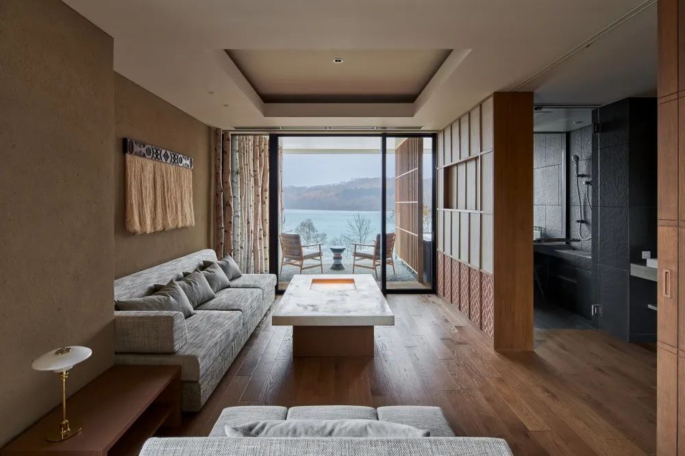 客房裡也設有一個休息區,圍繞著壁爐形狀的矮桌子,佈置了柔和的間接照明。這是為了致敬阿伊努人圍繞家中壁爐交談的習俗。
