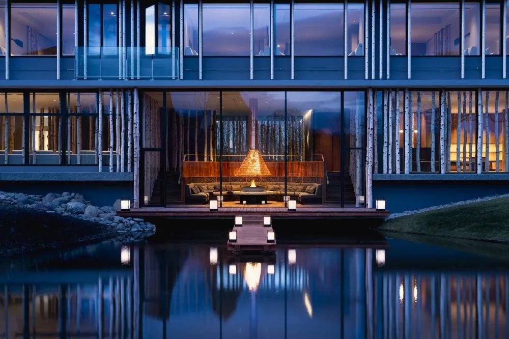 在湖的一側,客房所在的建築橫跨在水上。臨水處設計了一個下沉休息室,當客人坐在開放式壁爐旁邊時,可以透過落地玻璃窗欣賞到外面的獨木舟碼頭與不結冰的水面。