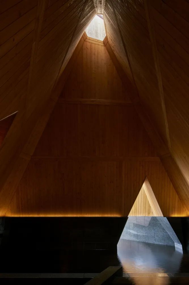 「△湯」是中村拓志以愛努族的獵人小屋為靈感設計的三角形建築,內部充滿了三角形元素,極具特色。夜晚時,「△湯」的照明會調至最低亮度,營造出彷彿置身於湖中的靜謐氛圍。