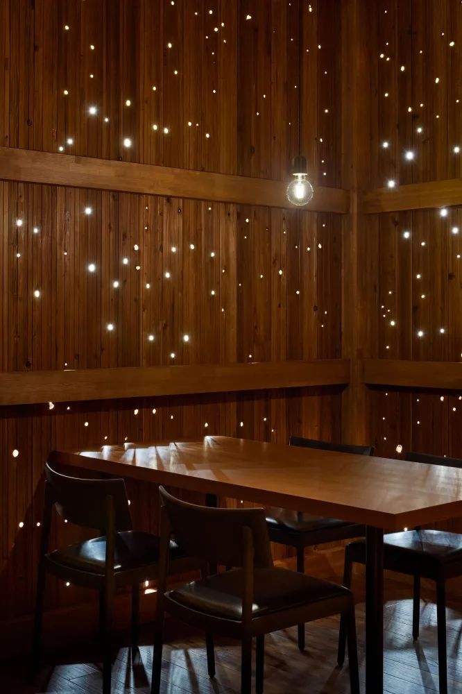 休息室的背面,臨窗一側設定了一排長桌,夜晚時分可以對著室外的風景小酌。木製隔板上鑿出一些小洞,亮燈後透出的光,讓人感覺彷彿置身於星空中。