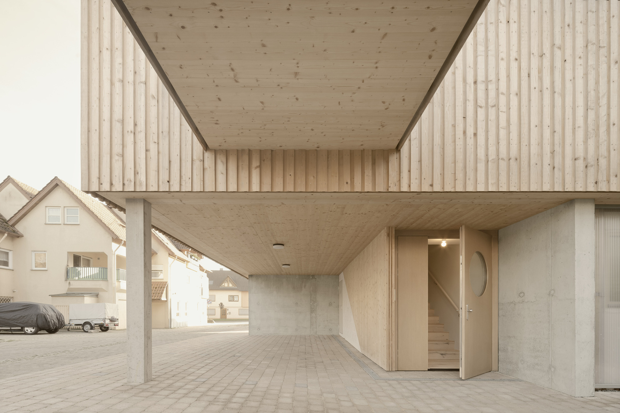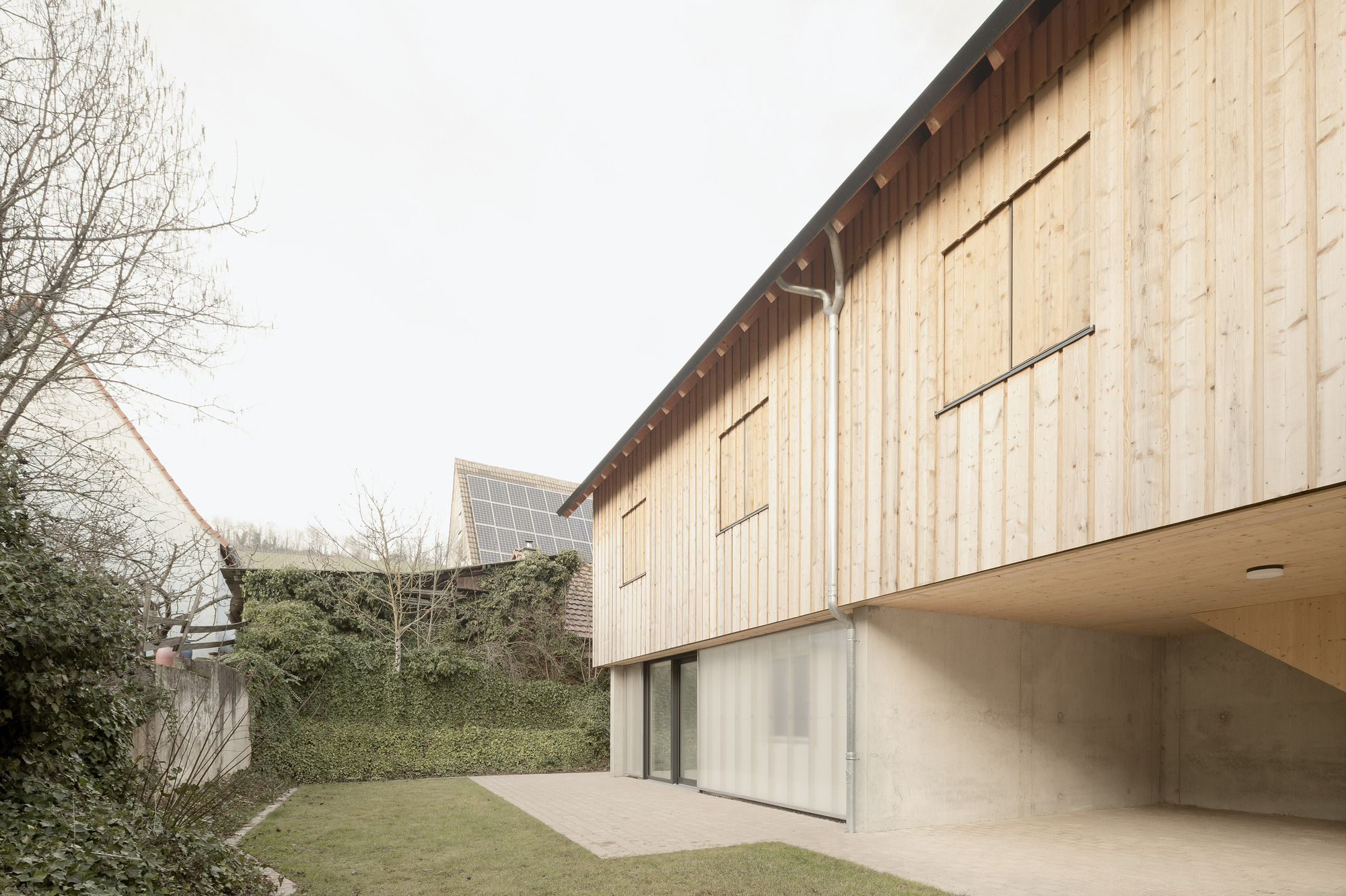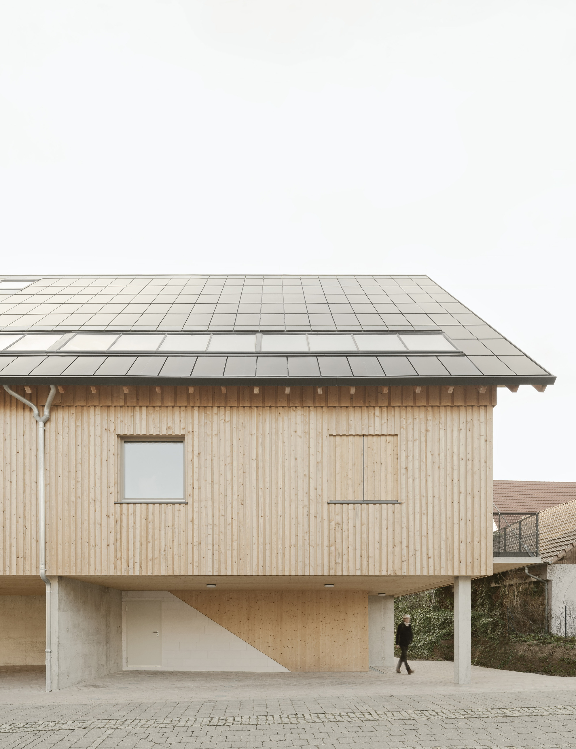 緊湊的量體被安置在一個混凝土十字結構與四個角柱之上,彷彿一座懸浮的方舟。當木質百葉窗緊閉時,建築物呈現出一種高架木造巨石(wooden monolith)的肅穆感,與下方開放通透的花園層形成強烈對比。透過這種手法,建築巧妙地呼應了周遭環境的紋理與屋頂形式,並以石材基座結合懸挑木構造的姿態,與村鎮中心的半木結構老屋展開跨越時空的對話。