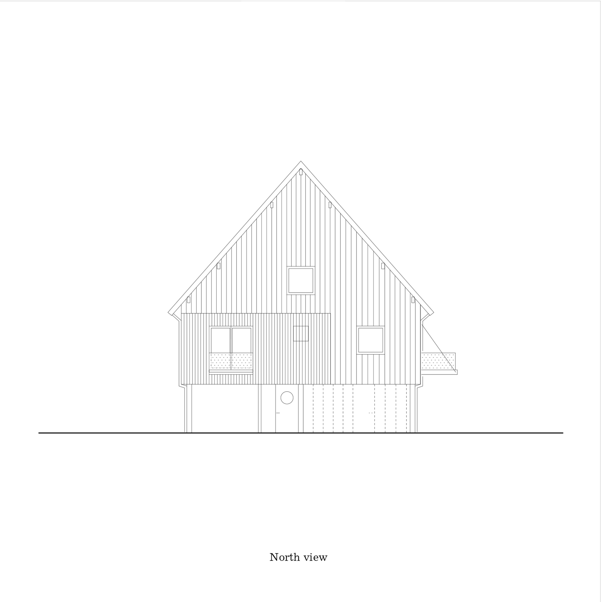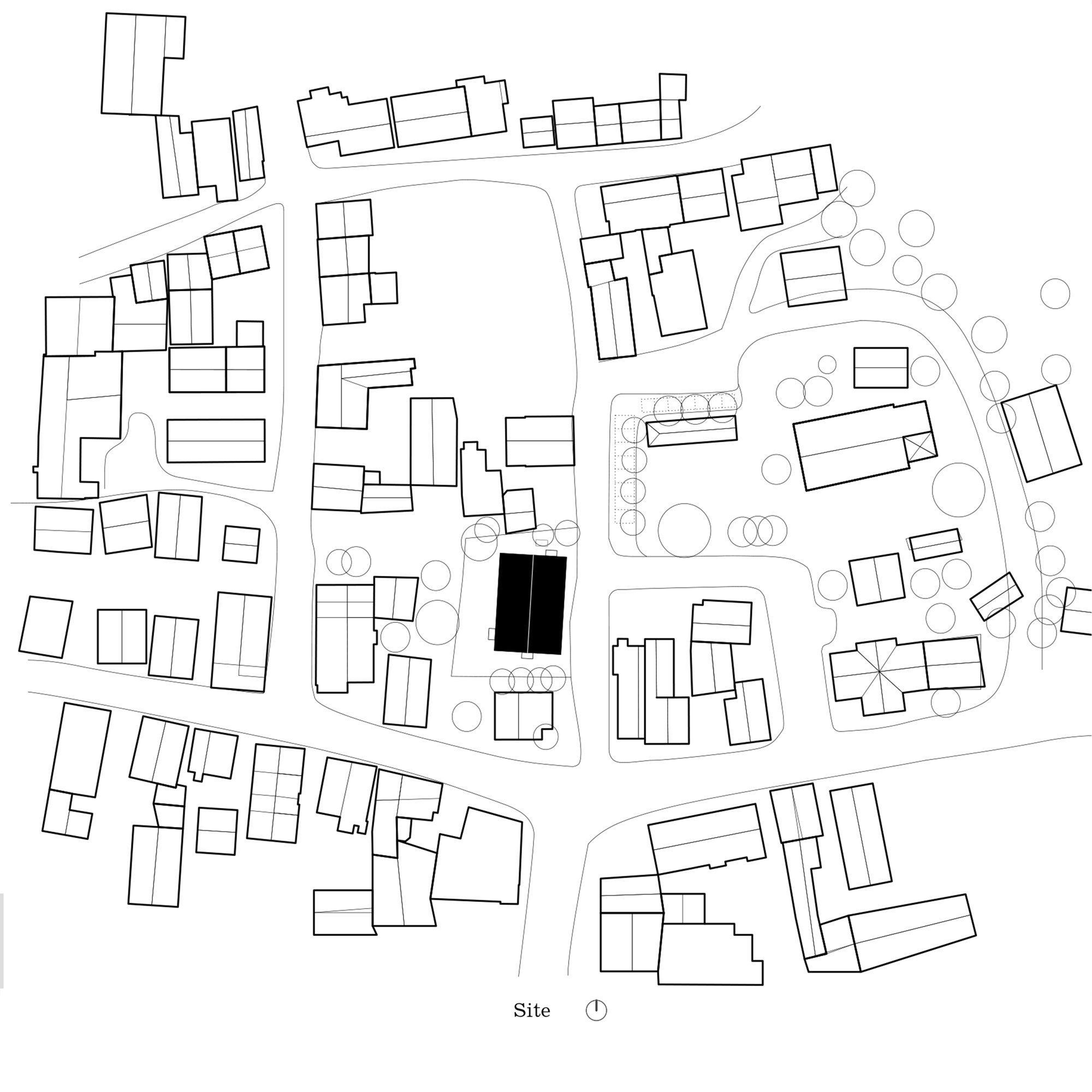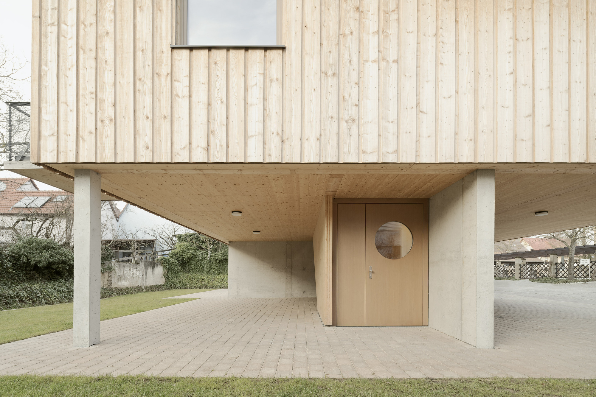 緊湊的量體被安置在一個混凝土十字結構與四個角柱之上,彷彿一座懸浮的方舟。當木質百葉窗緊閉時,建築物呈現出一種高架木造巨石(wooden monolith)的肅穆感,與下方開放通透的花園層形成強烈對比。透過這種手法,建築巧妙地呼應了周遭環境的紋理與屋頂形式,並以石材基座結合懸挑木構造的姿態,與村鎮中心的半木結構老屋展開跨越時空的對話。