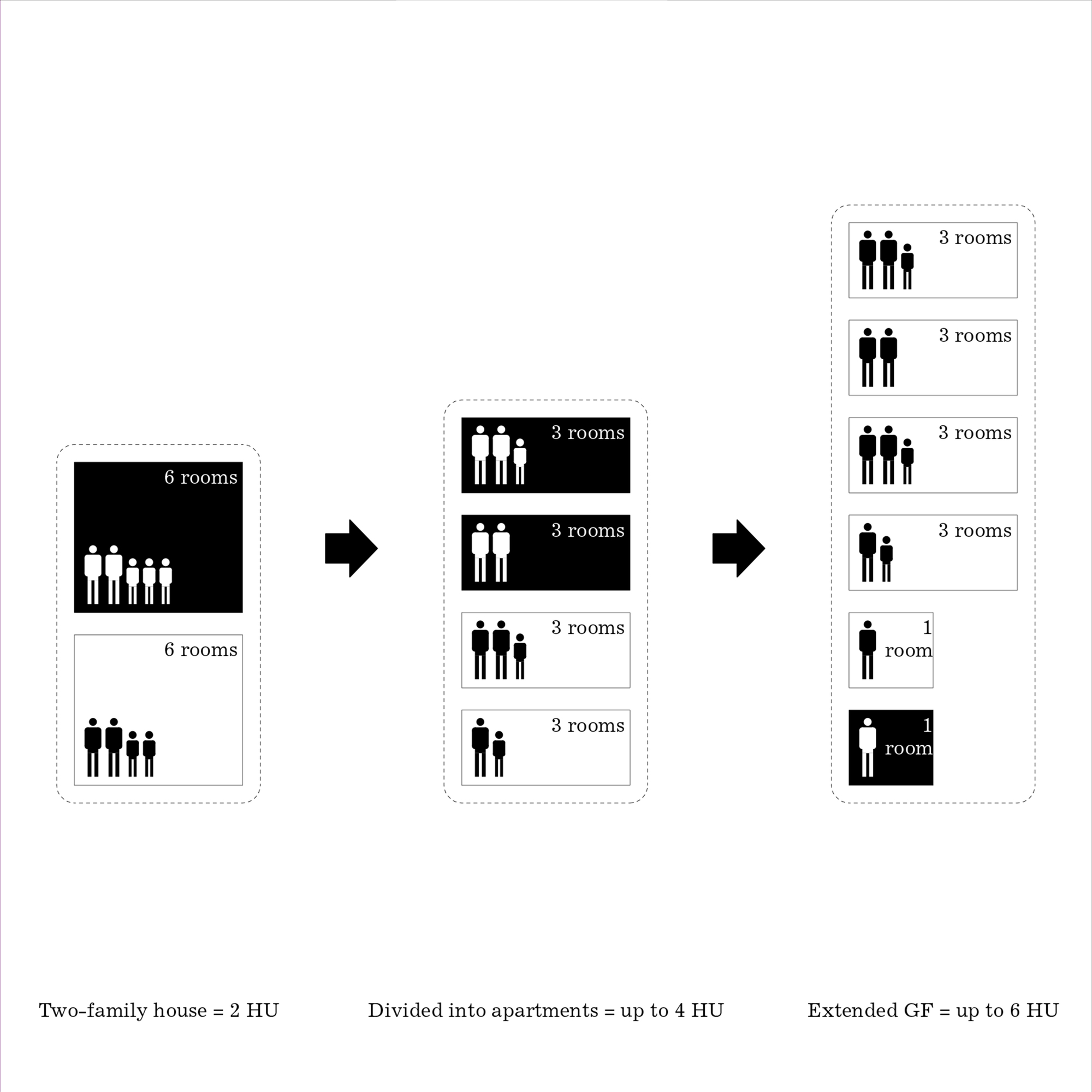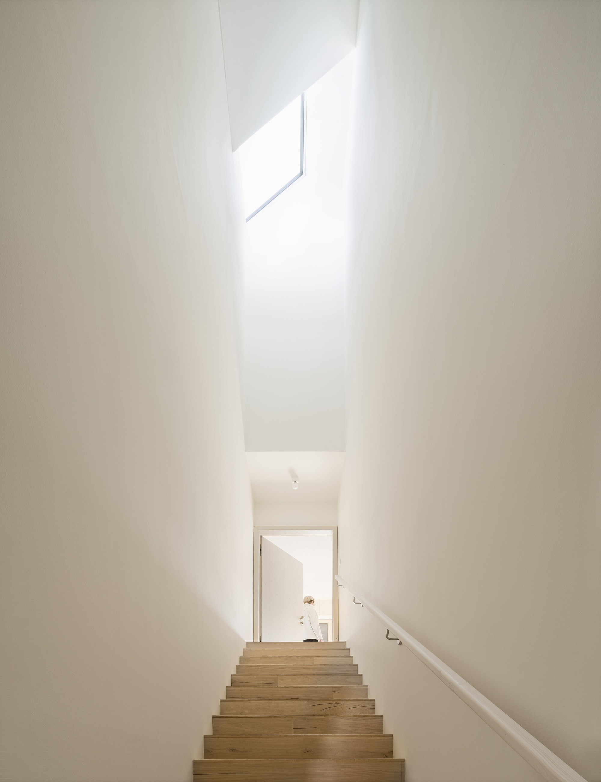 在這看似簡單的建築外殼之下,隱藏著一套複雜而精密的半獨立式住宅系統。兩戶居住單元透過各自獨立的樓梯連接至花園層,這意味著兩者的入口大門皆位於地面層,保有極佳的私密性。