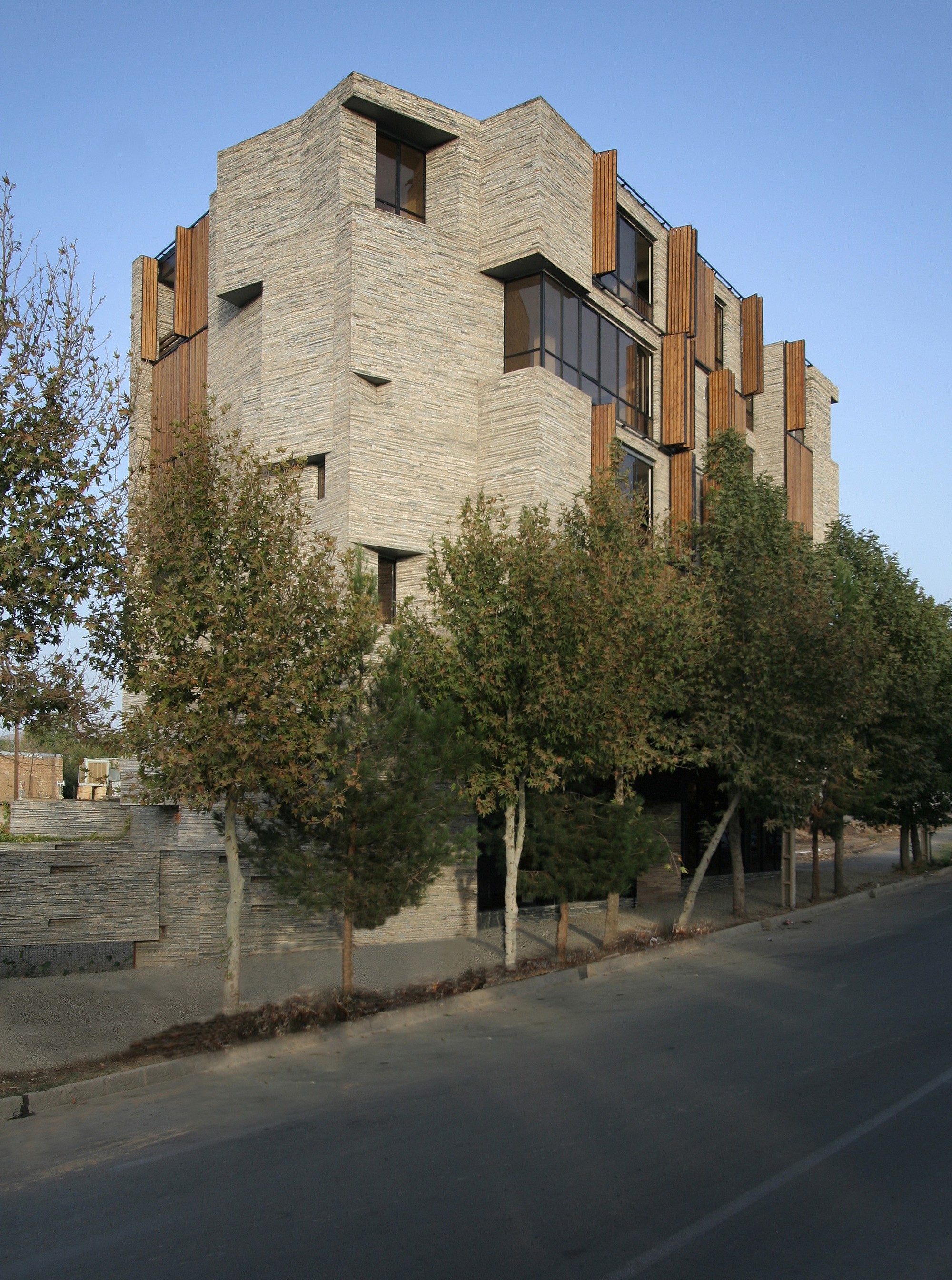 這棟建築的整體造型呈現出簡潔的稜柱幾何,予人一種樸實無華的印象,但天然石材與木料的溫潤質感,巧妙地平衡了其嚴肅的外觀。設計上充滿了因地制宜的智慧,較小的開窗,被刻意向外突出的三角形石塊所遮蔽,用以抵擋部分直射的烈日。而較大的開窗,則裝設了由當地木材製成的活動式木百葉。這些設計,都是對伊朗炎熱氣候以及當地相對保守生活方式的細膩回應。