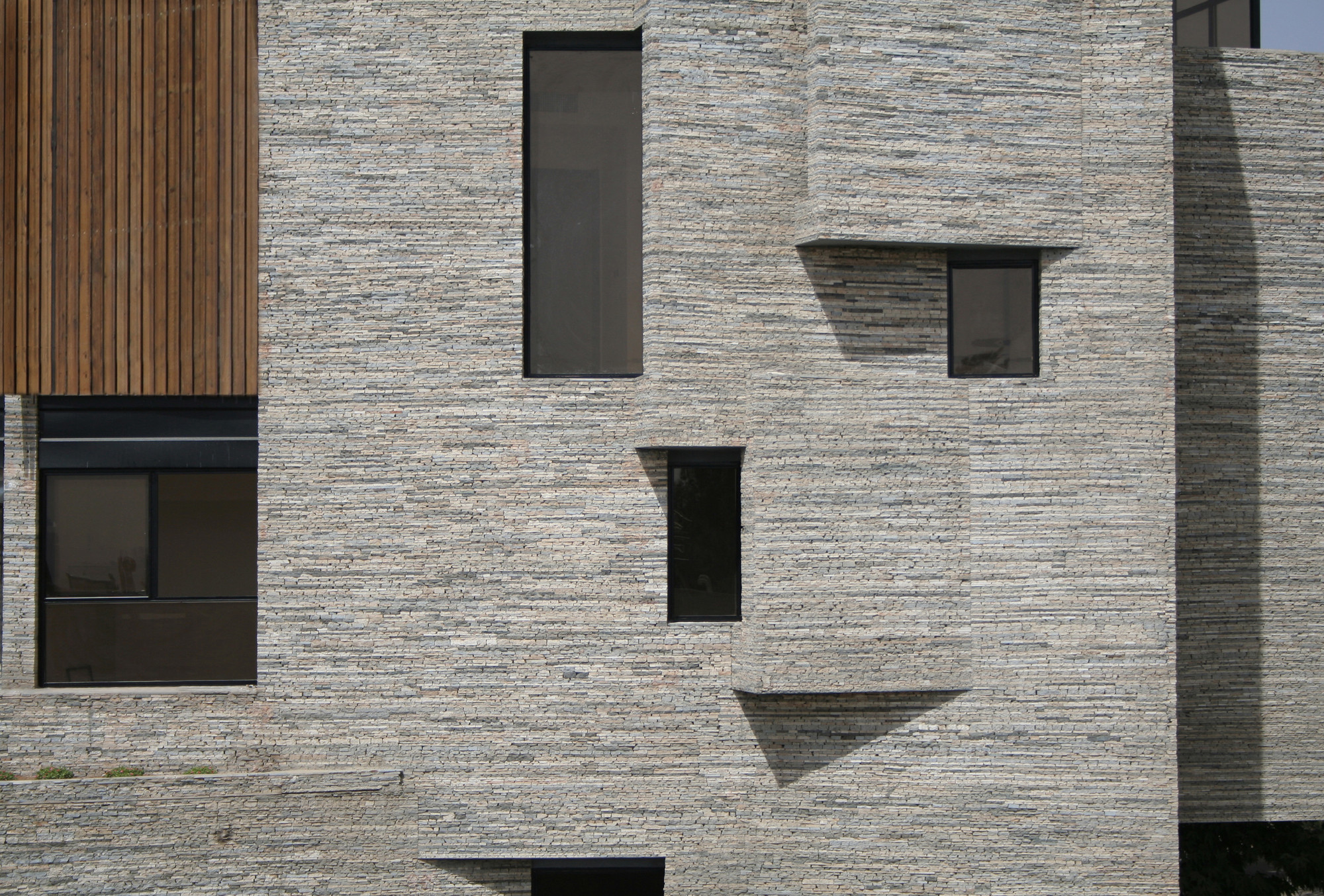 於是,一棟獨樹一格的建築物應運而生。「一號公寓」的四面外牆,幾乎全由回收的石材邊角料所包覆。這些石片色彩、尺寸與質地各異,共同交織出一幅渾然天成的圖案,宛如歲月的肌理。對馬哈拉特的居民來說,這種粗獷而熟悉的視覺語彙,並不會帶來冒犯或疏離感,反而親切地讓人聯想起鎮上隨處可見的採石場景觀。建築因此不再是外來者,而是從在地記憶中提煉出的風景。