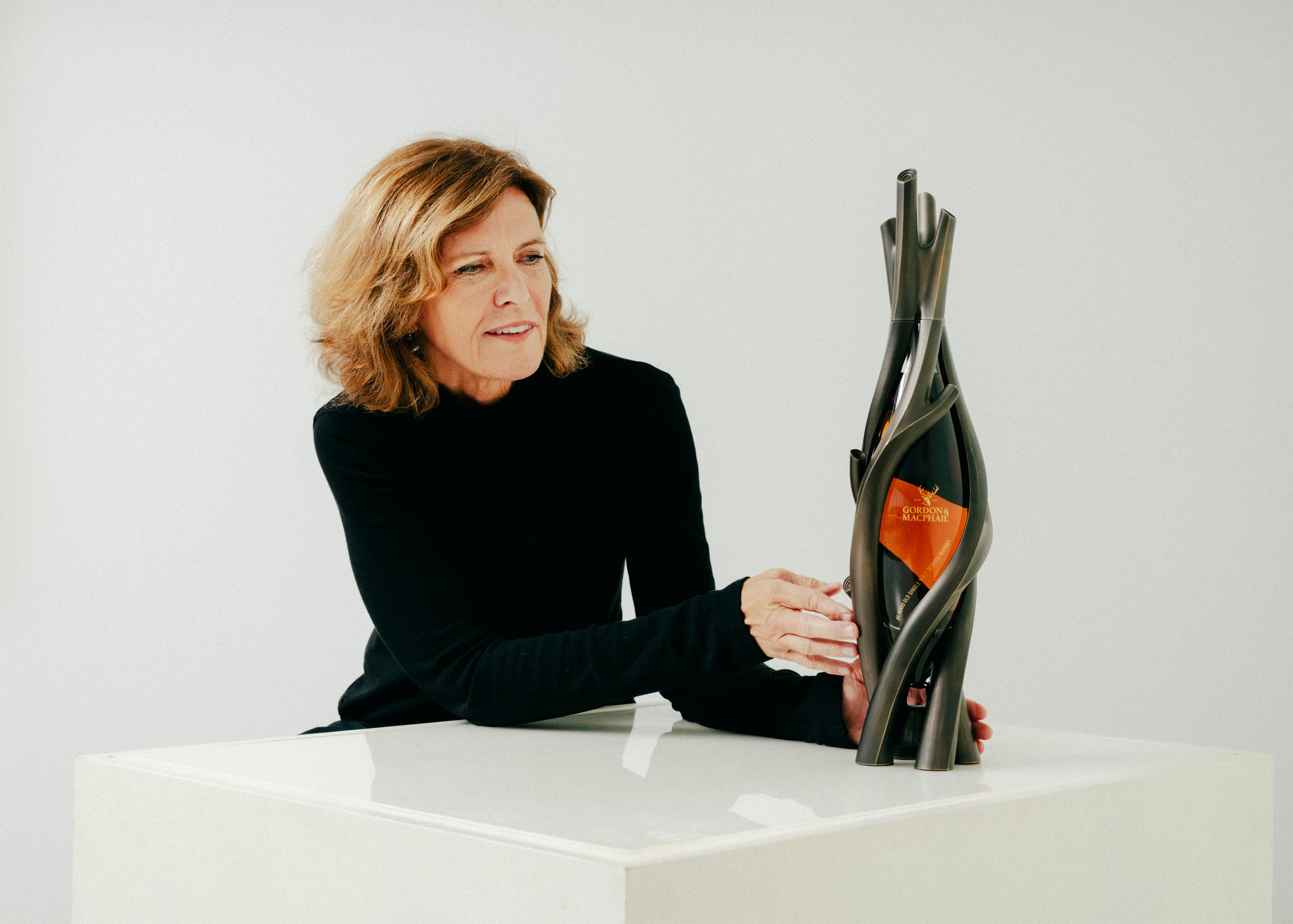 限量生產125瓶的樹枝狀外殼以青銅鑄造而成。Gang選擇這種材質,不僅考量耐久性,更著眼於隨時間推移產生的色澤變化。「選擇配得上世界最古老單一麥芽蘇格蘭威士忌的材質至關重要,」她說明,「我為纏繞的枝幹選用青銅,因為這種材質極度耐久,隨著銅綠形成會愈發美麗,正如威士忌的琥珀色澤與特性隨歲月加深。」