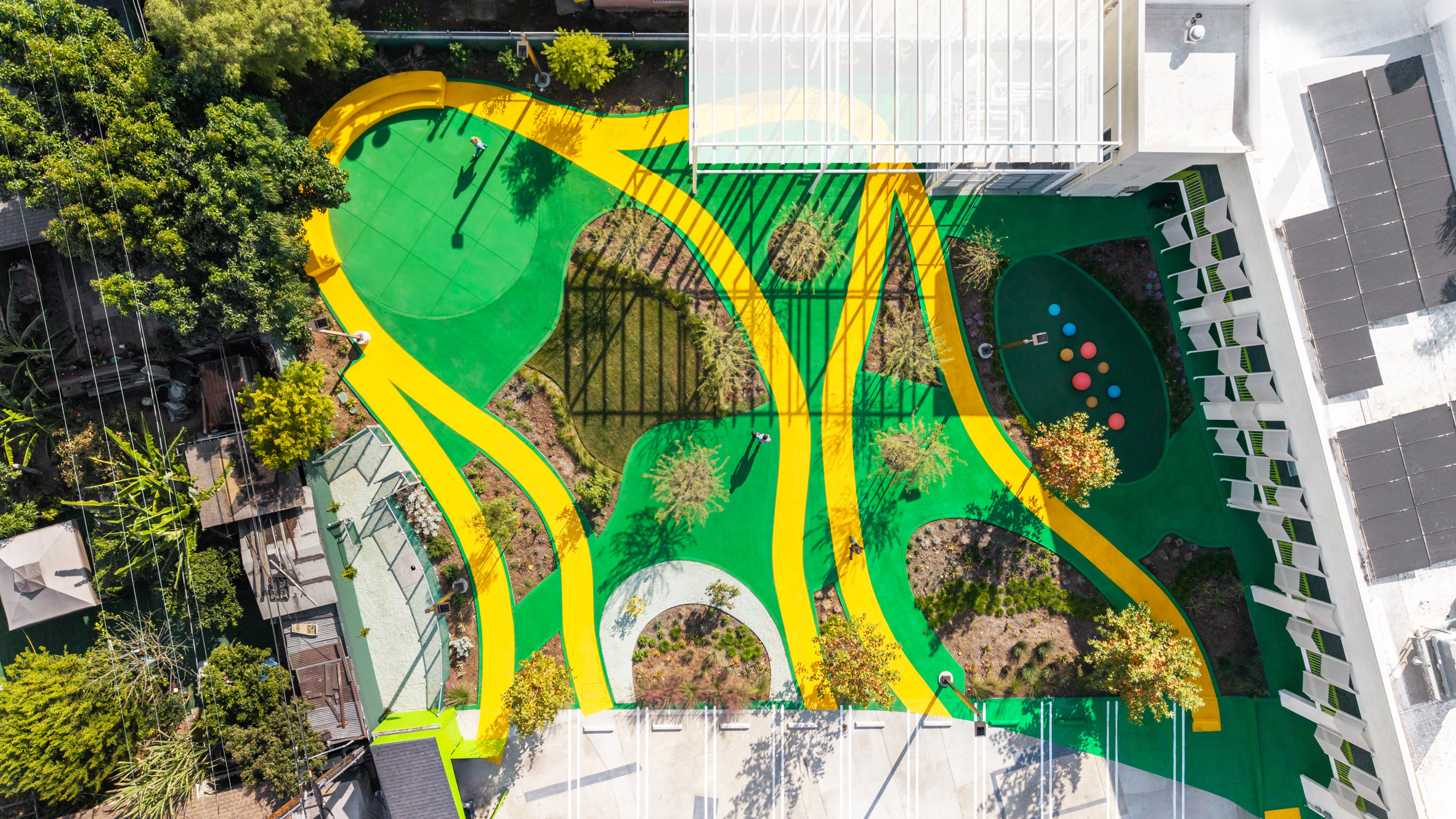 原本地面上滿布垃圾箱與廢棄混凝土的停車場,在這次修復計畫中被徹底活化。 Kadre Architects 將其轉化為擁有遊樂土丘、寵物專區與雨水花園的綠洲。為了對抗洛杉磯的熱島效應,現場增設了遮陽棚結構與大量原生花草,提升了微氣候的舒適度。精準增建公共空間,不僅美化了東康普頓的土地紋理,更透過 2026 年標準的全電化節能設備與屋頂太陽能板,實踐了環境永續與社會正義的雙重承諾,讓老建物在現代機能中獲得新生。
