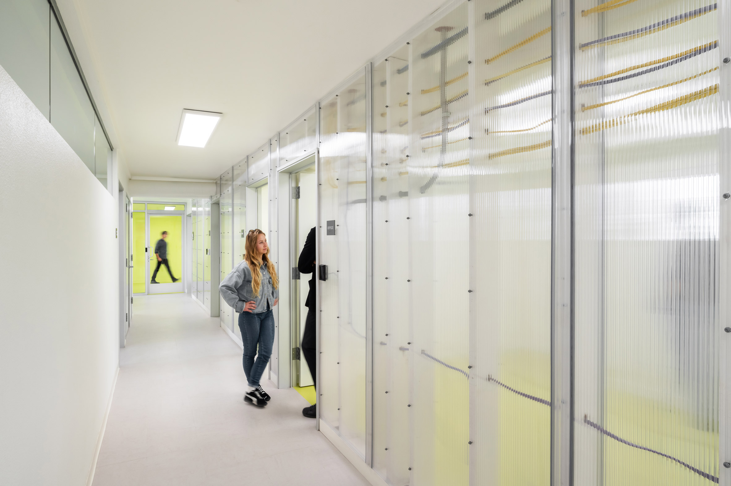 基地由兩棟L型排列的建築組成,總面積達22,000平方英尺(約2,044平方公尺)。為了在開放與私密之間取得微妙平衡,建築團隊在外立面加裝了客製化的沖孔金屬板網格。這些網格不僅具備遮陽功能,更創造出一種類似拱廊的走道空間,交錯於建築外部。