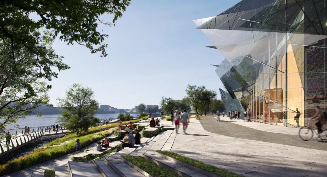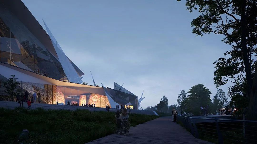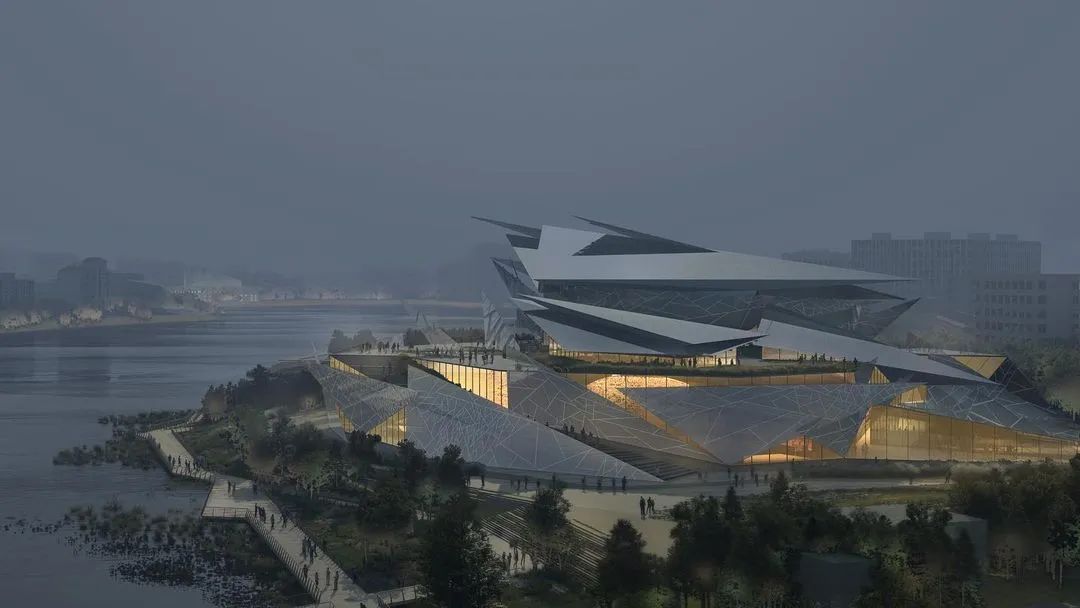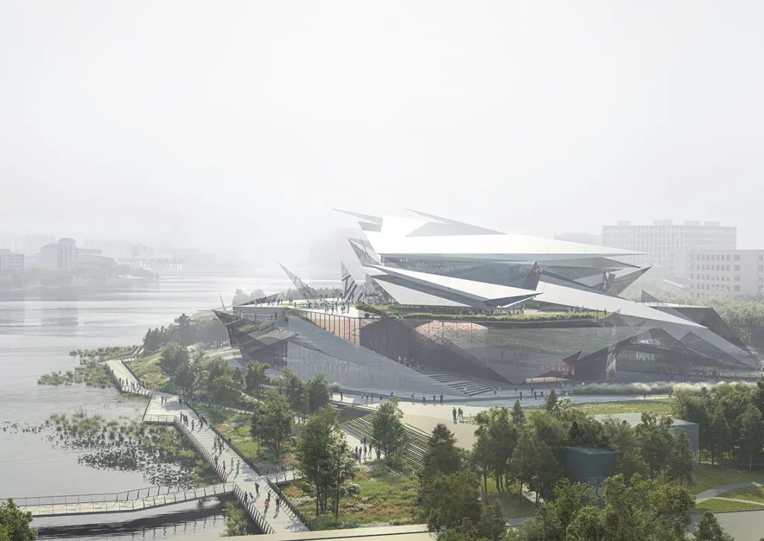 在寒冷的冬季,建築量體將與周遭的冰雪地景合而為一,彷彿從湖面生長出來的結晶;到了夏季,多面切割的透明立面則會映射出粼粼波光,達成建築與水景的完美交織。這種「尖銳」且充滿抱負的形式,精準地回應了韃靼文化、建築與藝術中特有的精神特質。建築不再是突兀的異物,而是順應地形紋理生長的有機體,透過行人路徑與休閒區域的整合,將既有的濱水景觀提升至全新層次。