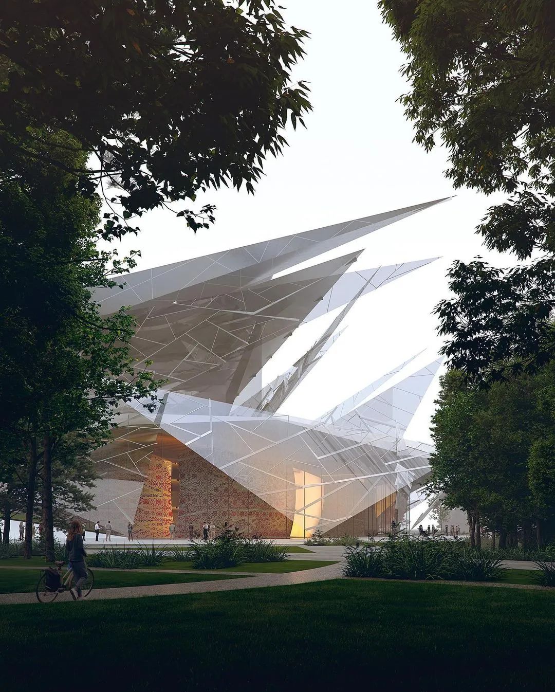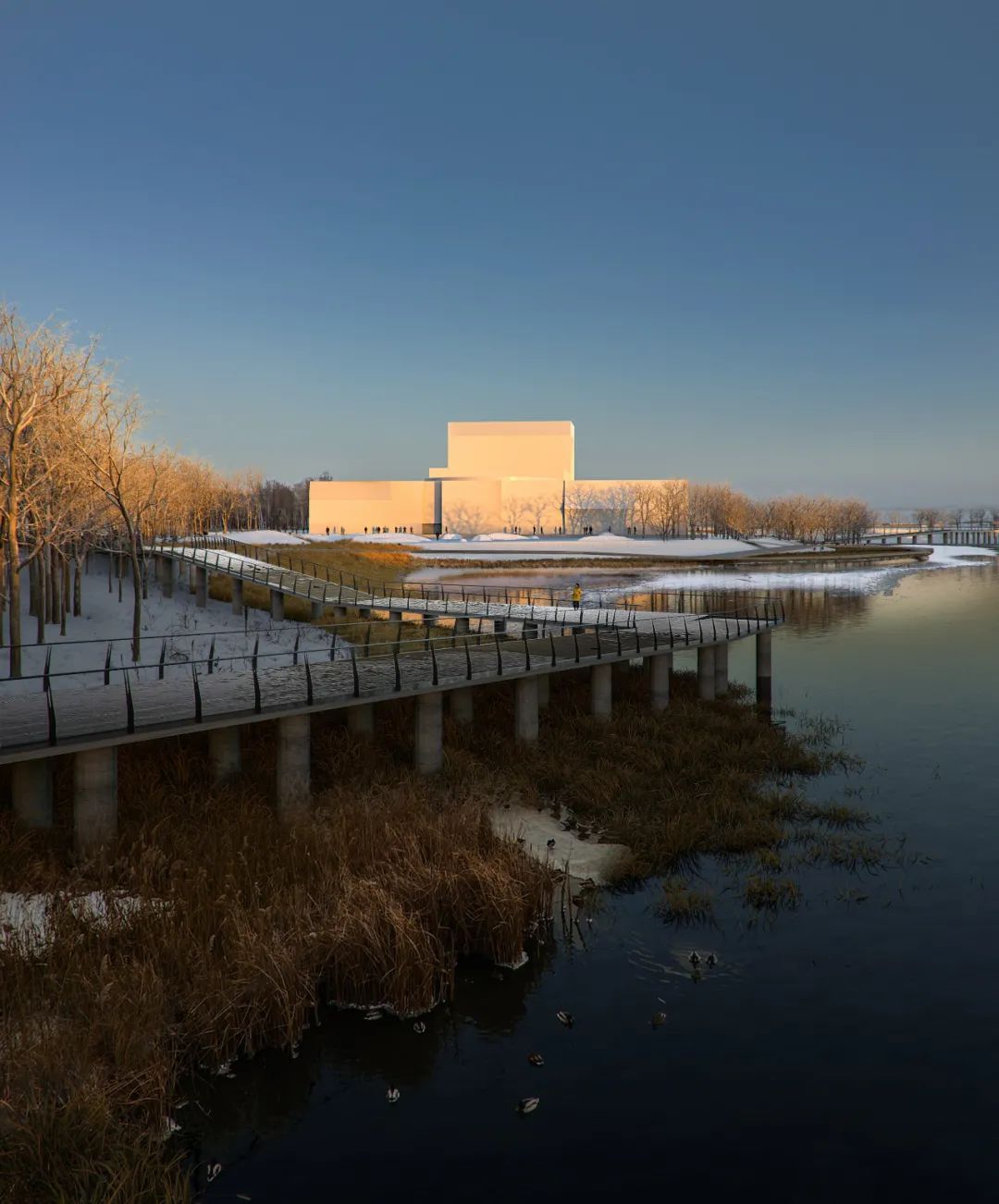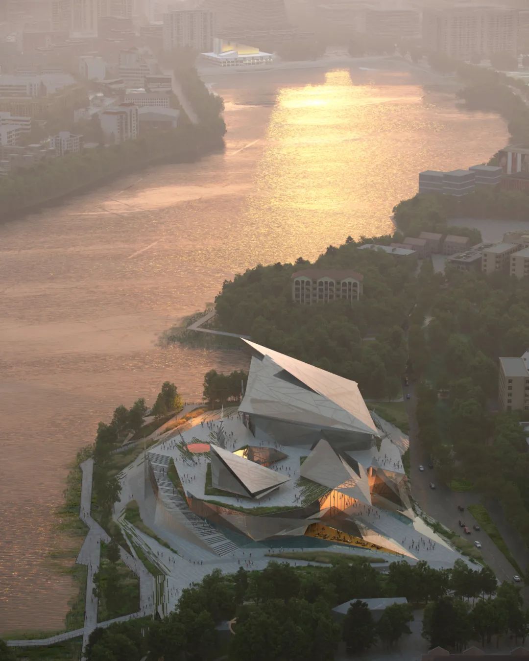 在寒冷的冬季,建築量體將與周遭的冰雪地景合而為一,彷彿從湖面生長出來的結晶;到了夏季,多面切割的透明立面則會映射出粼粼波光,達成建築與水景的完美交織。這種「尖銳」且充滿抱負的形式,精準地回應了韃靼文化、建築與藝術中特有的精神特質。建築不再是突兀的異物,而是順應地形紋理生長的有機體,透過行人路徑與休閒區域的整合,將既有的濱水景觀提升至全新層次。