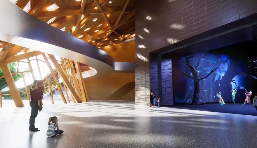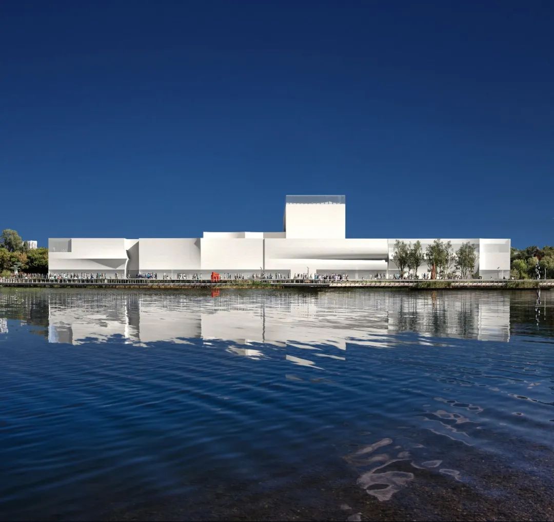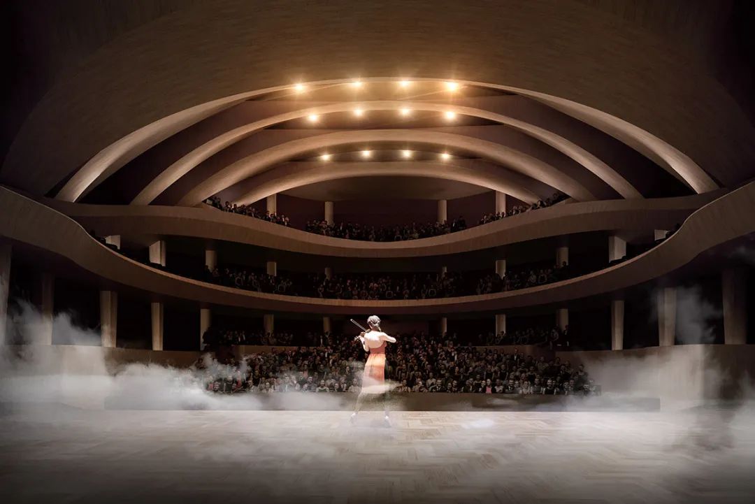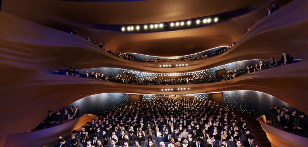 門廳被定義為「城市客廳」,在視覺上串聯起城市與湖泊,來自四面八方的入口引導著參訪者的動線,同時引入自然光線與通風。設計方案亦細膩考量了劇場工作者的需求,為藝術家與行政人員規劃了寬敞的活動場域,並將地下樓層面積極小化,以降低營造成本並利於後續維護,顯示出團隊在美學與實務之間取得的精妙平衡。