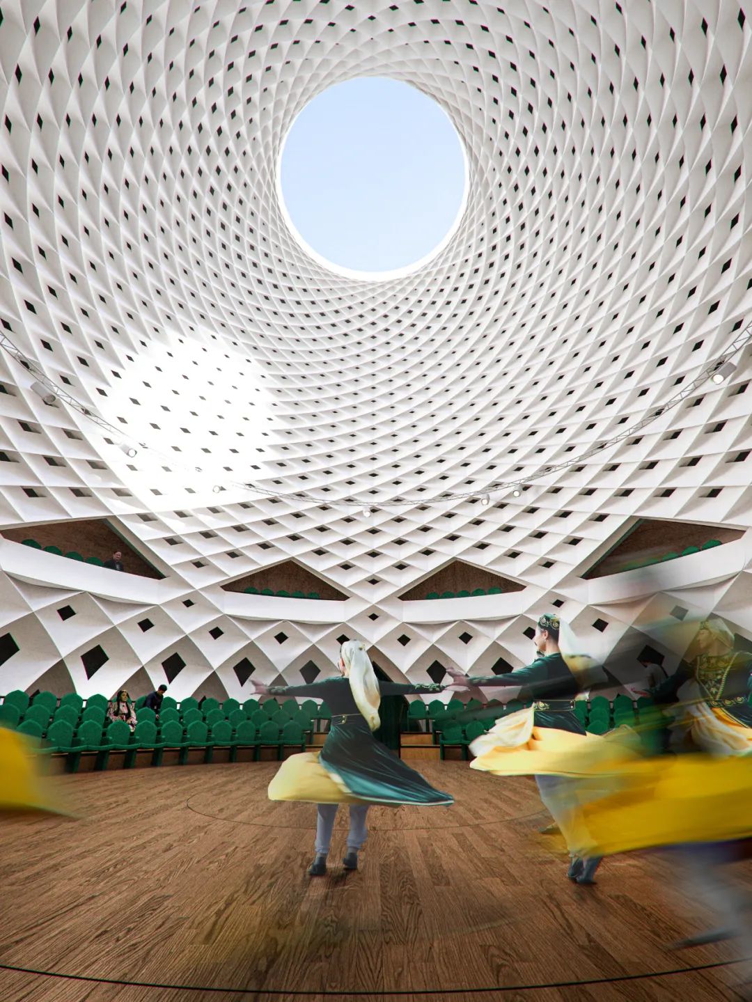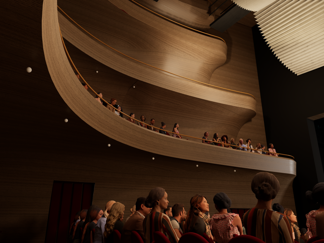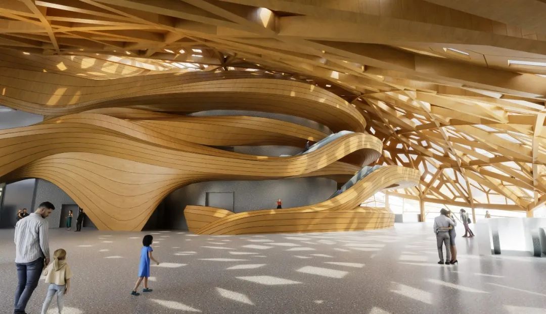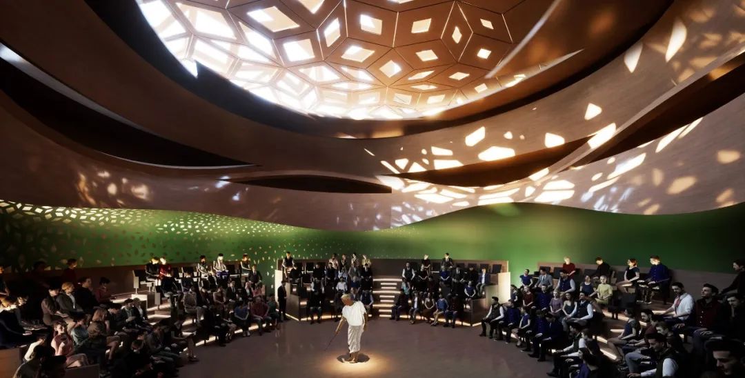 門廳被定義為「城市客廳」,在視覺上串聯起城市與湖泊,來自四面八方的入口引導著參訪者的動線,同時引入自然光線與通風。設計方案亦細膩考量了劇場工作者的需求,為藝術家與行政人員規劃了寬敞的活動場域,並將地下樓層面積極小化,以降低營造成本並利於後續維護,顯示出團隊在美學與實務之間取得的精妙平衡。