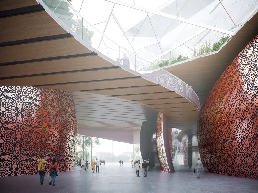 照明設計是首先照亮門廳內部溫暖的空間,然後使光線沿立面上的三角形面板逐漸發散。室內和主大廳的設計取材於美麗的韃靼手工藝品和裝飾品,從它們複雜的設計中汲取元素來創造一個溫暖舒適又有魅力的空間氛圍。建築的門廳被設計成一個“城市會客廳”,在視覺上連通了城市與湖泊。建築為市民提供了多個不同的入口,劃分多種路徑的同時也引入了光線和空氣。