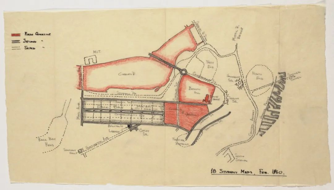 為了研究人們對於波士頓的認知地圖,林曲讓每一位受訪者畫了草圖,其描述其對所在城市形態的直觀印象 這種方法本質上就是現在我們講的「大數據」。只是在當時的技術條件下,無法像今天這樣收集和處理數以百萬計的數據,林曲花了幾年時間,也不過收集了一百多個數據樣本,但這些樣本已經足夠支持其結論。 值得一提的是,麻省理工學院後繼有人,2013年,城市規劃系與資訊系的兩名中國學者劉瀏和周博磊通過分析Google地圖上人們分享的照片,以真正大數據的方法支持了城市的意象中的結論。
