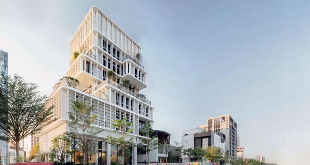 建築量體上設置了逐層退縮露台,在固定的容積下推高了建築高度與份量,並豐富了建築體,也主導了整體建築物的個性,形成本建築物最主要的識別性。這些露台,同時做為植物生長的地方,有植物也就能帶來豐富的立體生態,也軟化了剛硬的建築空間。此外,也用了很多天然景石、原生種植栽,這些都是設計團隊認為可與建築物彼此契合,又能適應環境,因此應用於本建築物的各部份。