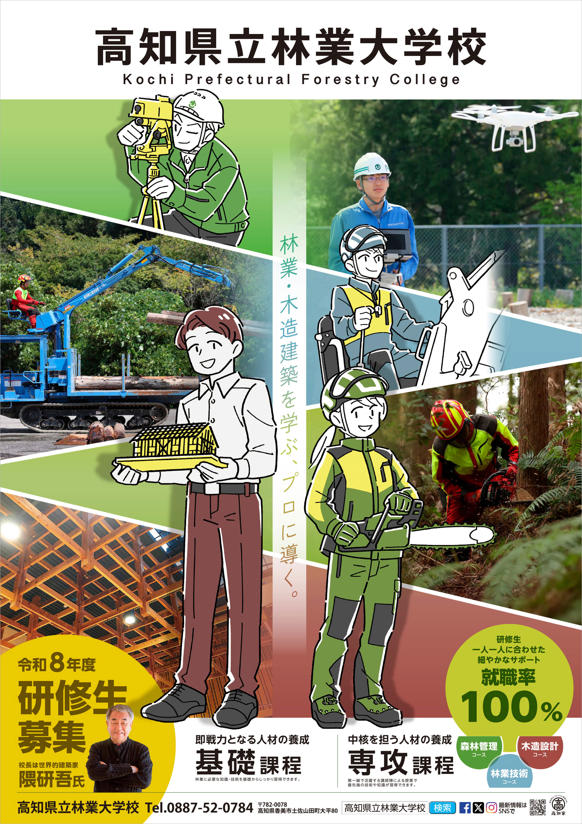 在森林率日本第一的高知縣,高知県立林業大学校是一所能在林業、木材產業、木造建築各領域從基礎到專業技術都能紮實學習的學校。以培育擔負高知縣林業的優秀人才為目的,平成27年4月以高知縣立林業學校先行開校,平成30年4月加入專攻課程,以高知縣立林業大學校正式開校。