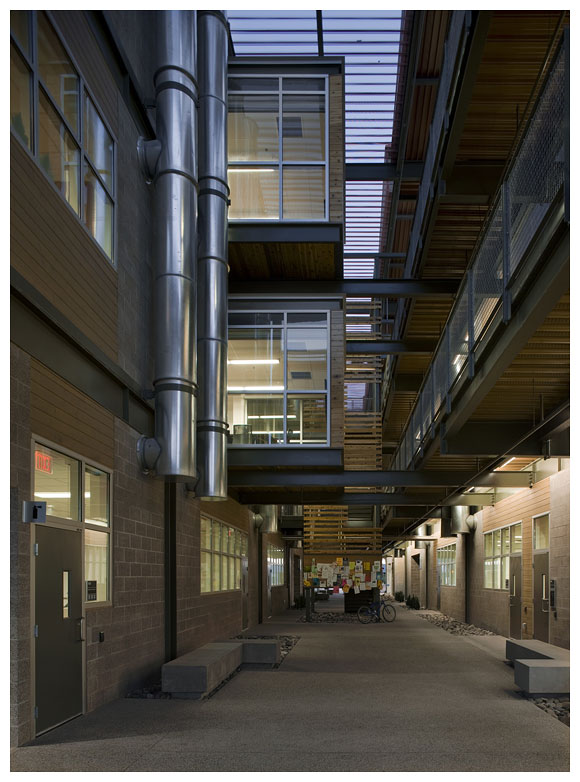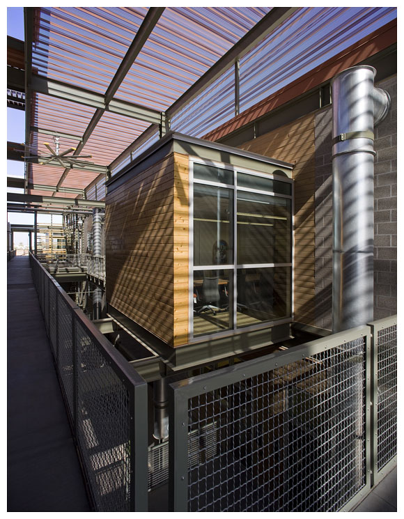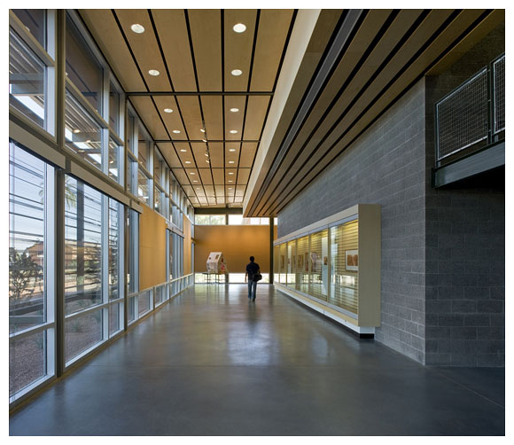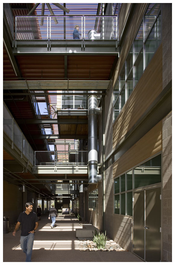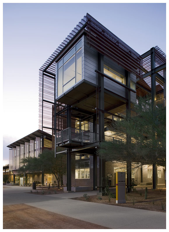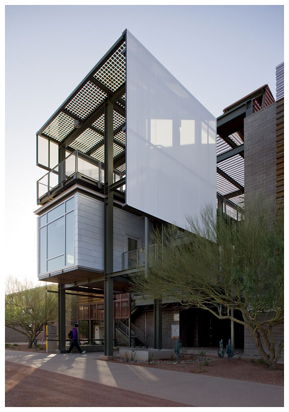新建成的 ASU 理工學院校區五棟教學大樓,容納了四個不同但課程內容互相連貫的學院,作為物理、化學,生物等科系所使用的實驗室和教室空間,建築師以東西軸向配置教學大 樓量體,串連三棟既有建築物,環繞著三個中庭,形成一連串天井、出入口、廊道,適度引進季節變換的風向,Lake | Flato Architects 建築師事務所設計團隊放棄磚造或混凝土造的厚牆,改以波浪板、沖孔板、木格柵、玻璃等輕質材料作為其皮層。