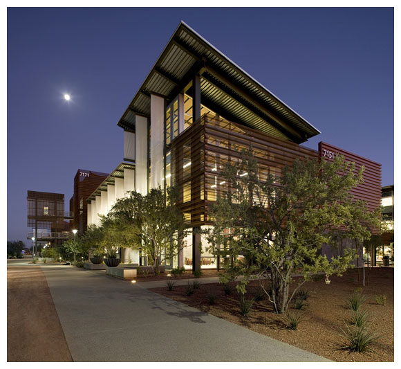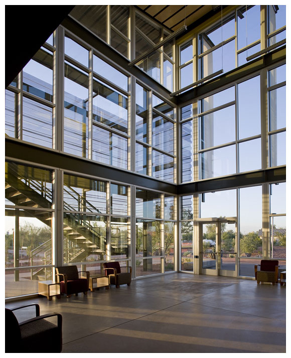 2005年起,亞利桑納州政府規定,以政府經費興建的所有建物都必須達到綠建築 LEED 的銀級認證,對設計者而言,這反而成為一種驅領思考方向的良善動力, Lake | Flato Architects 建築師事務所設計團隊經過縝密的計算後,為ASU 理工學院新校區帶來了五棟具永續價值的教學大樓,有效地解決環境給人類的挑戰。