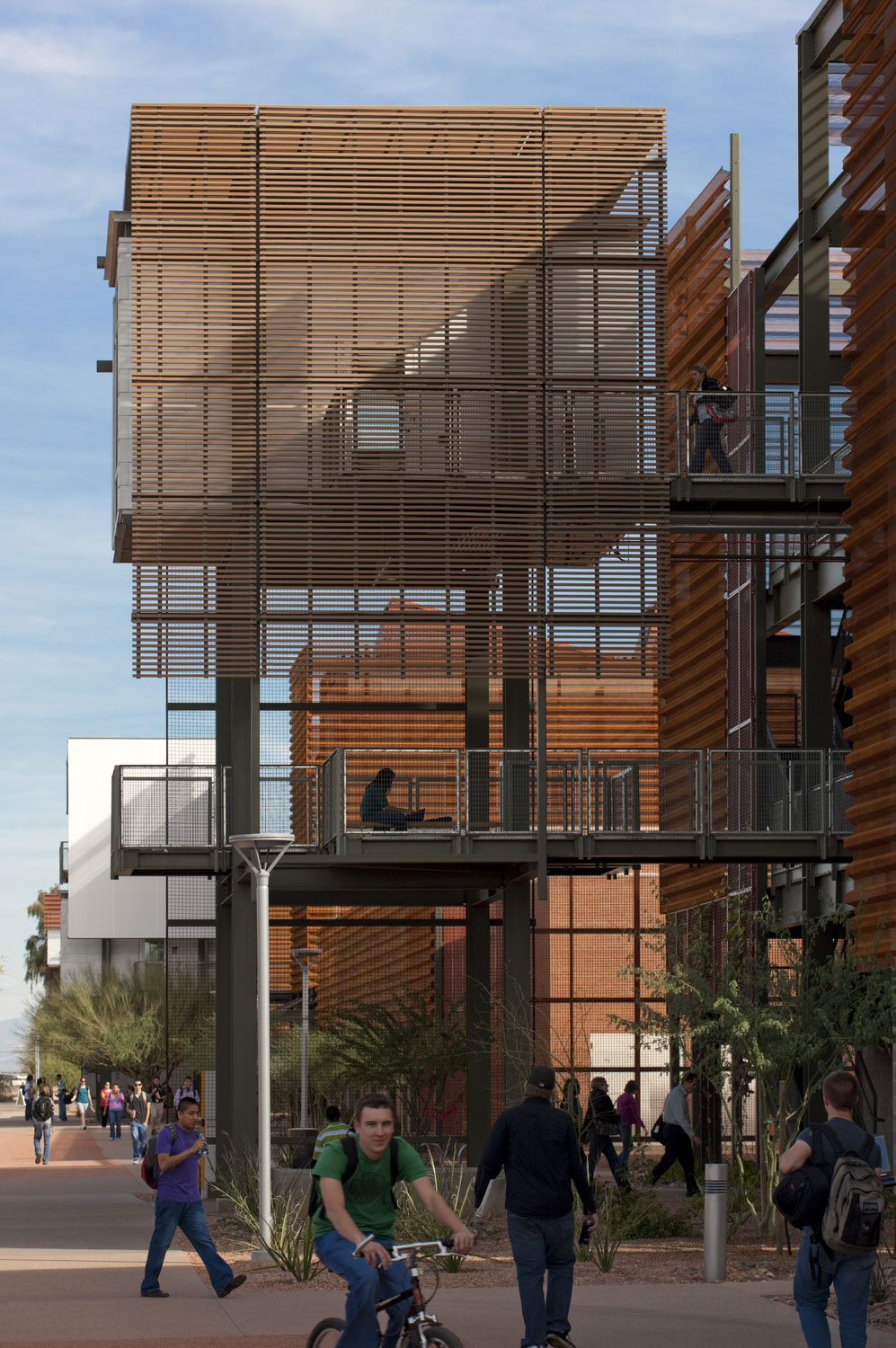 ↗ ASU 理工學院五棟教學大樓以波浪板、沖孔板、木格柵、玻璃等輕質材料作為其皮層