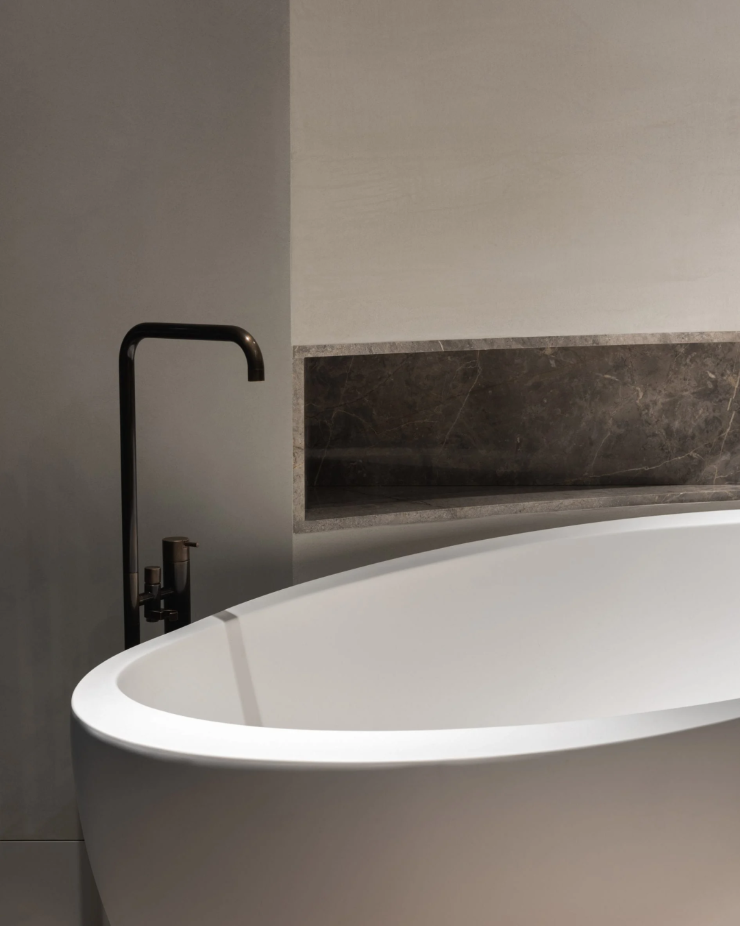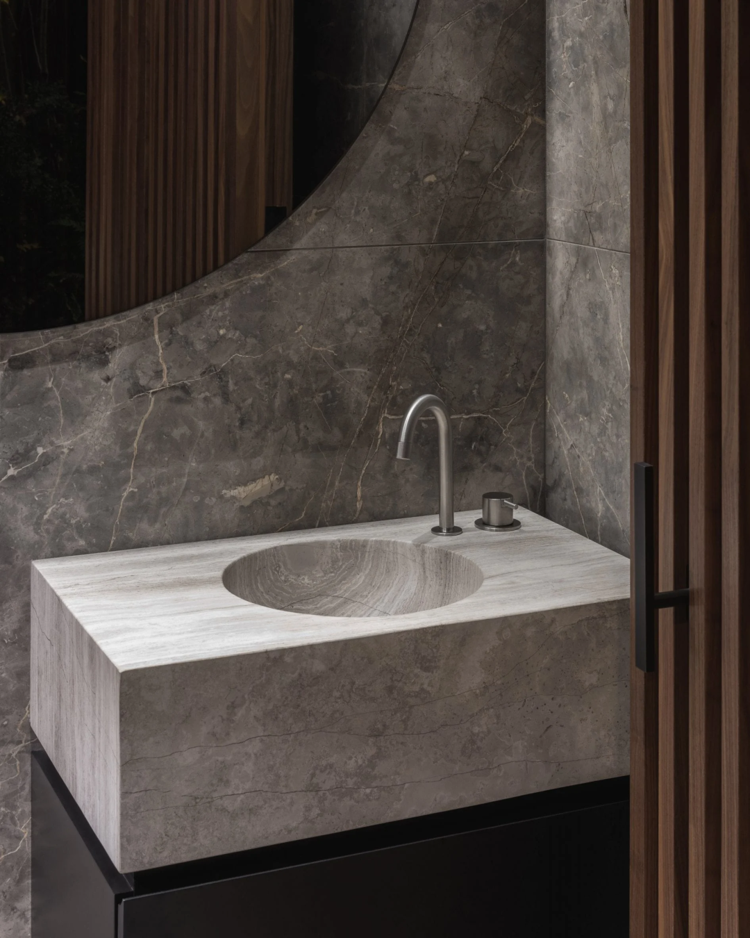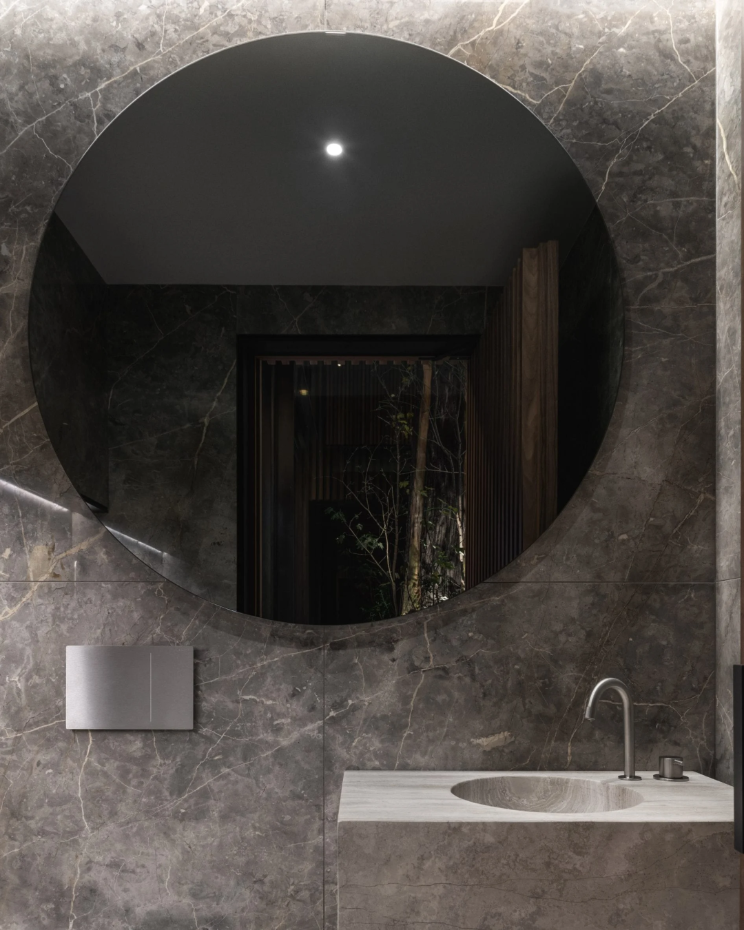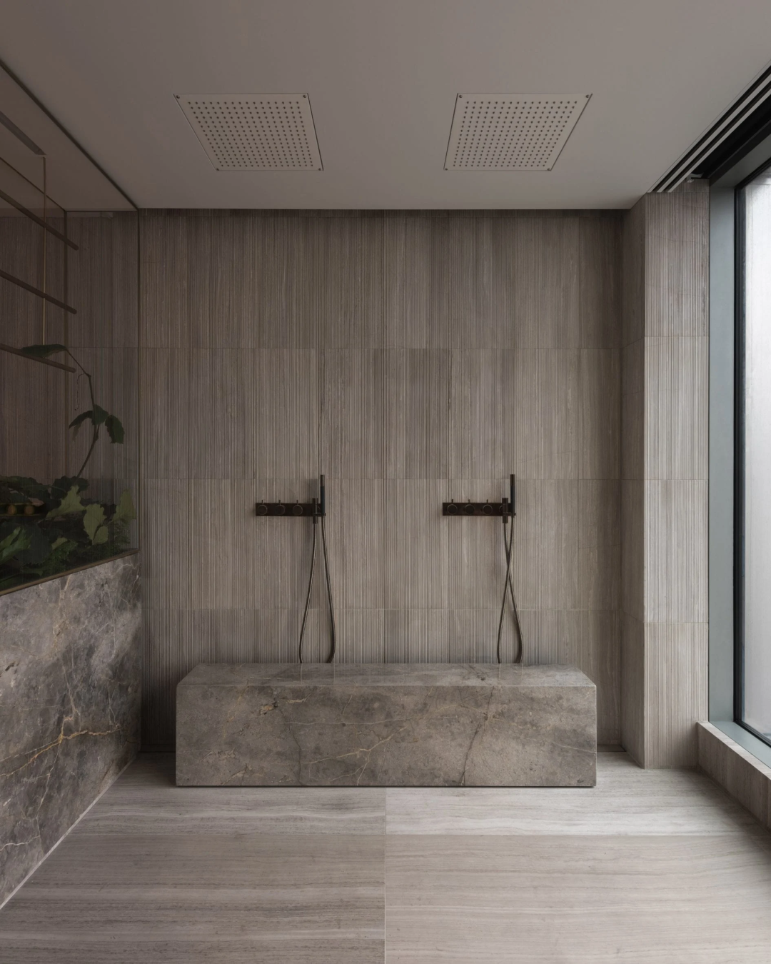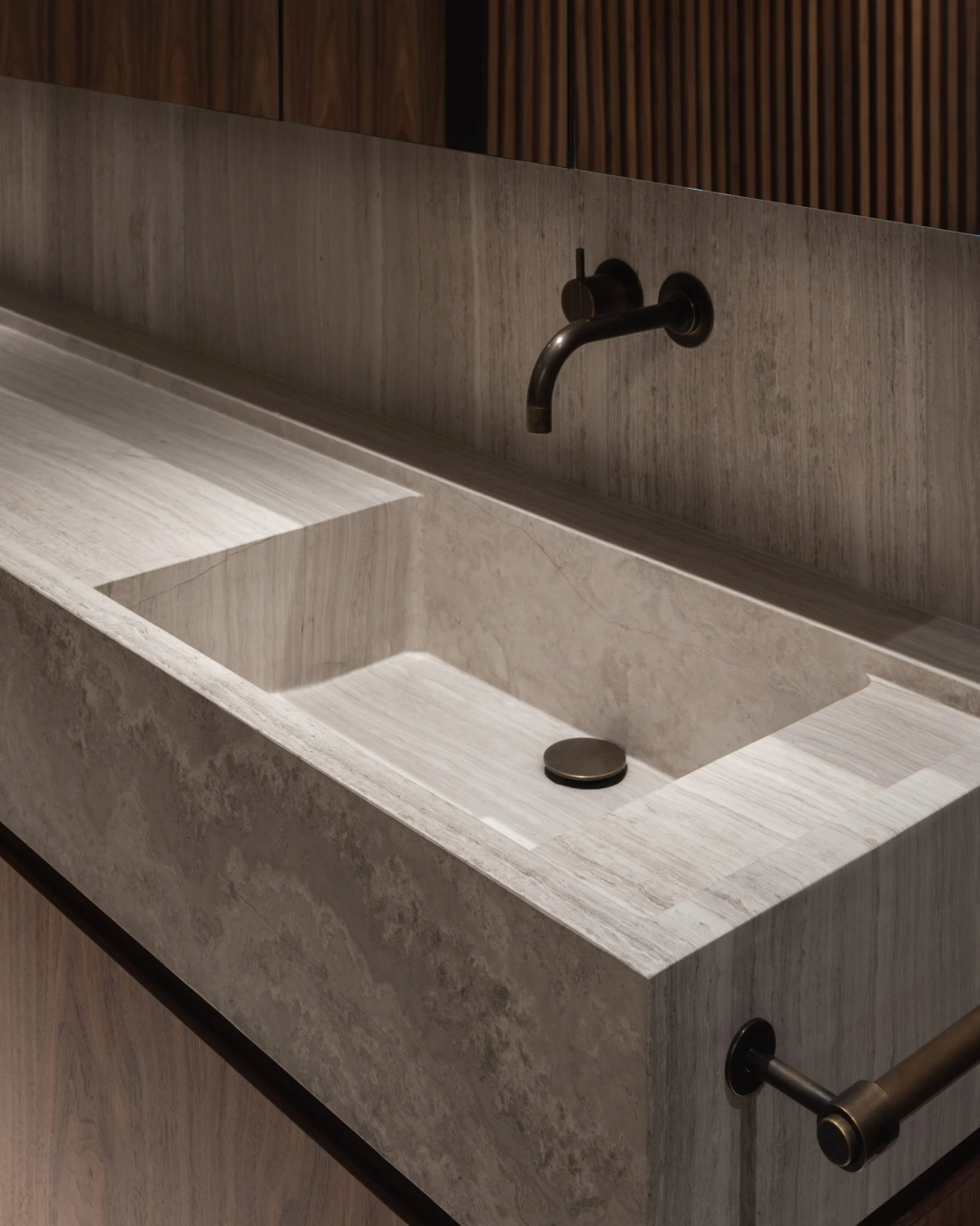石灰華被用於地板和定製的浴室水槽。一間衛浴的牆壁上鋪著煙灰色的大理石。