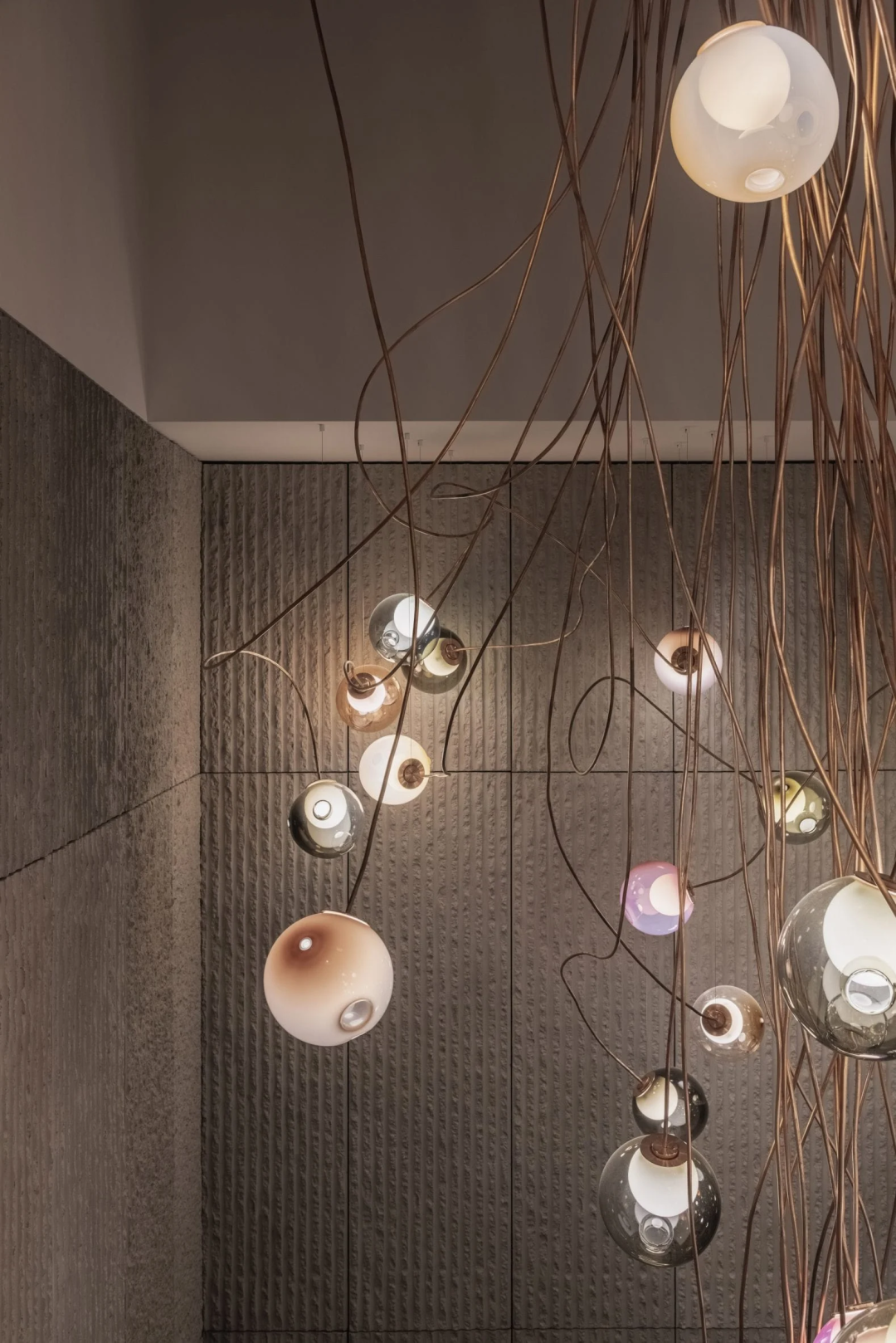 漂浮在樓梯間的是Bocci的照明裝置,它讓人想起一簇閃閃發光的螢火蟲。這件作品由銅和122個玻璃燈具組成。