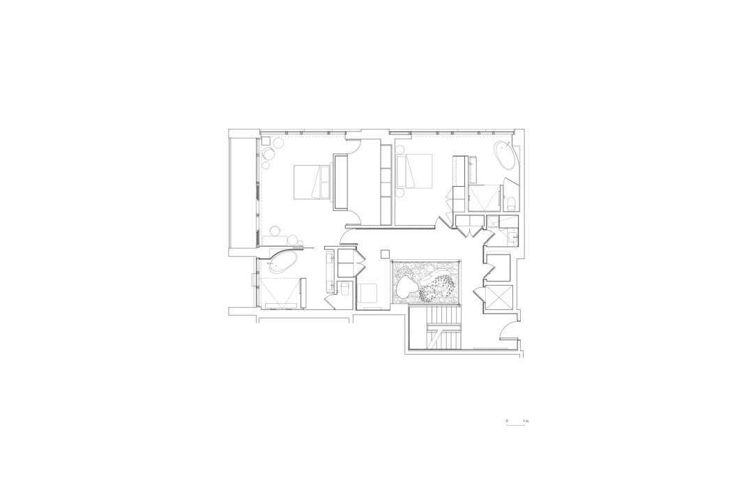 作為頂層公寓的主軸,中庭沿著樓梯間延伸,從公寓的底層一直延伸到屋頂露台,在頂部,它向天空開放。