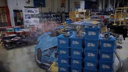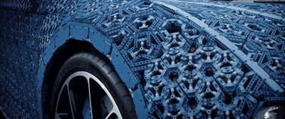 至於難以攻克的難題:車身獨特的流線型設計。 利用小塊樂高積木,以三角形為基礎,將它們互相連接成網狀結構「樂高織物」。 再進一步把網狀結構拼接,就形成了能彎曲的「樂高網」。