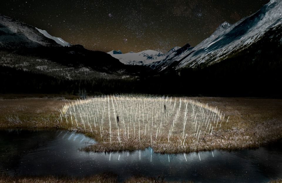 光田的裝置是以人身等高的光苗為基本單元,立於地上,模擬植物於土地長出的姿態;其受風來回擺動時,象形出顛倒的人字,將自然中天、地、人三者連接一體,點明人存在自然體系中的關係;而其光芒也同時帶來希望,並提供守護。