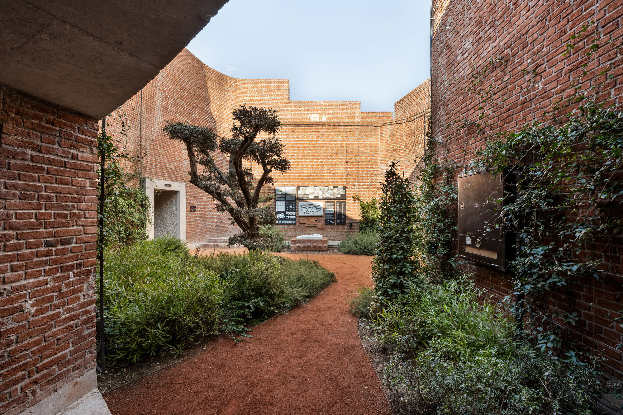 進入這座半地下的近現代歷史敘事空間,需沿著一條三叉坡道緩緩而下。主入口大廳被設計成一個半橢圓形、邊界模糊的空間,混凝土拱頂板與磚拱共同構成了這裡的特徵,讓人聯想到鯨魚的腹部,既包容又神秘。