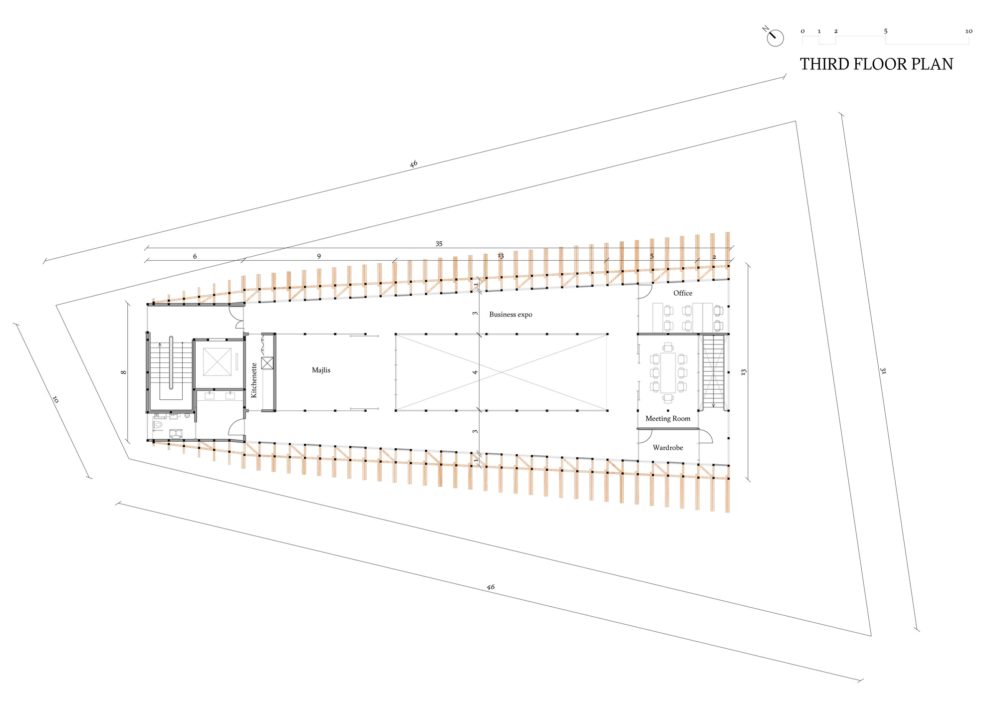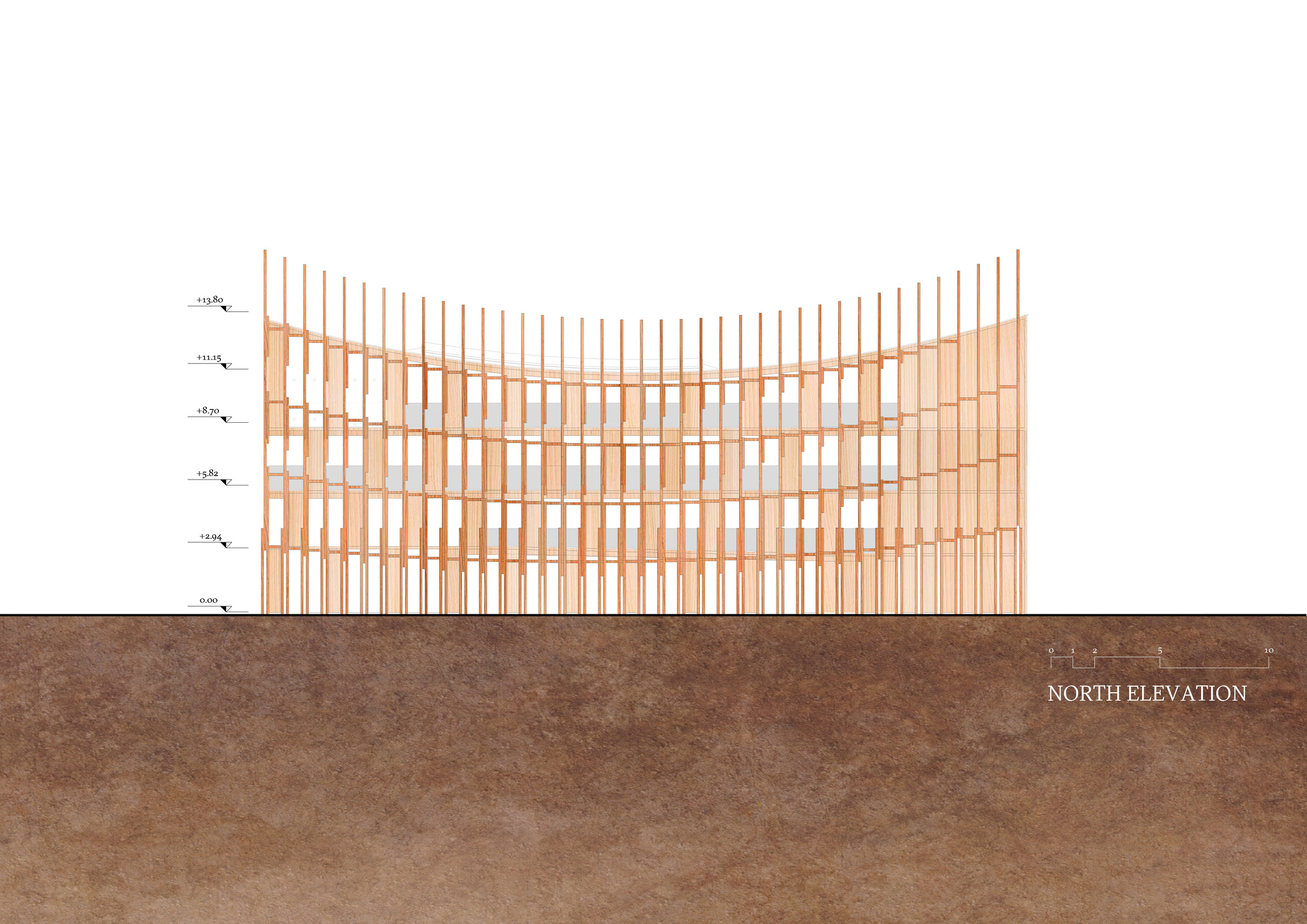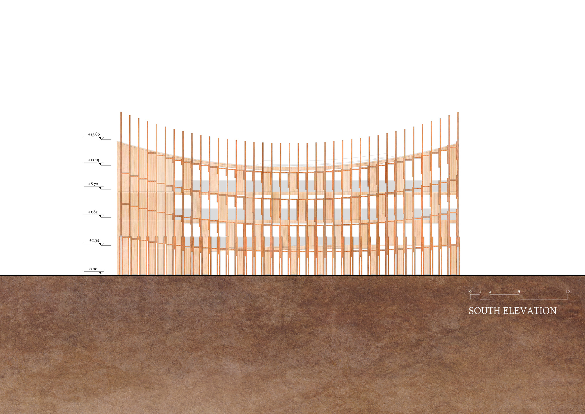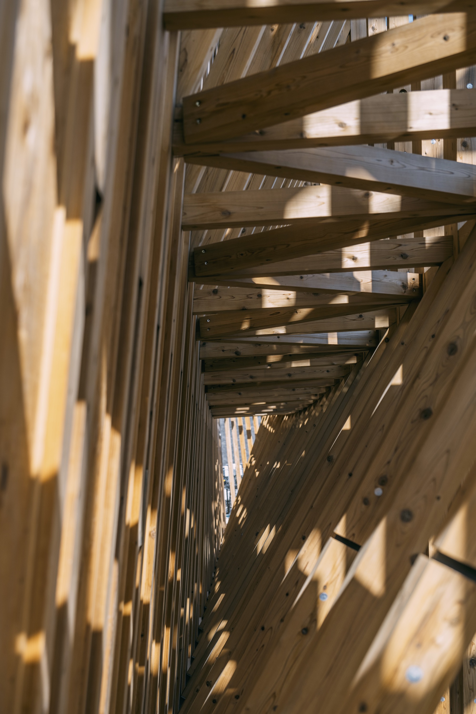 這座木構展館總樓地板面積達995平方公尺,採用3000塊日本扁柏(Japanese cedar)木材建造而成,展現東西方建材交流的成果。建築結構從展館側面以規律紋理向外延伸,刻意營造「海上船隻橫梁運動」的視覺效果,使靜態建築呈現動態美感。