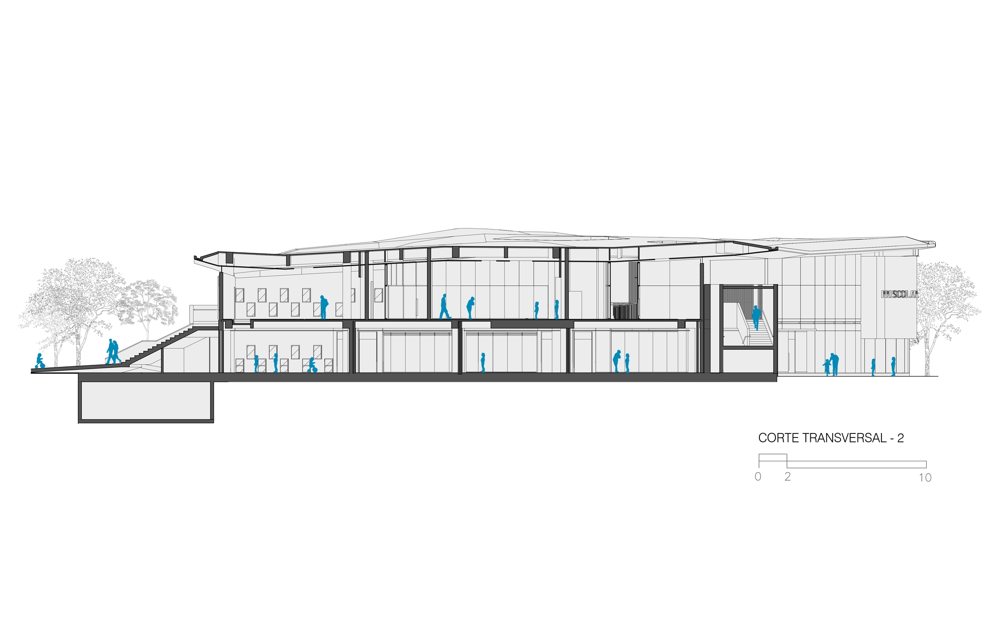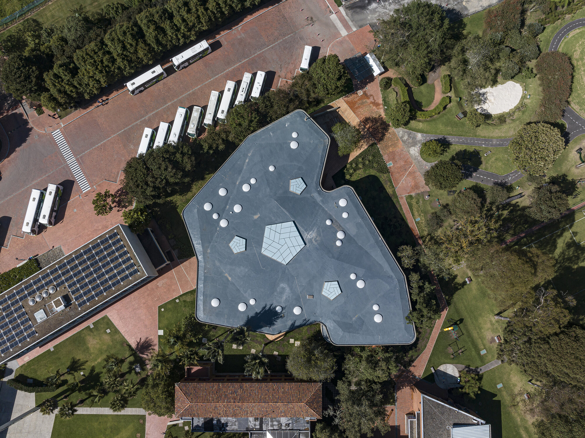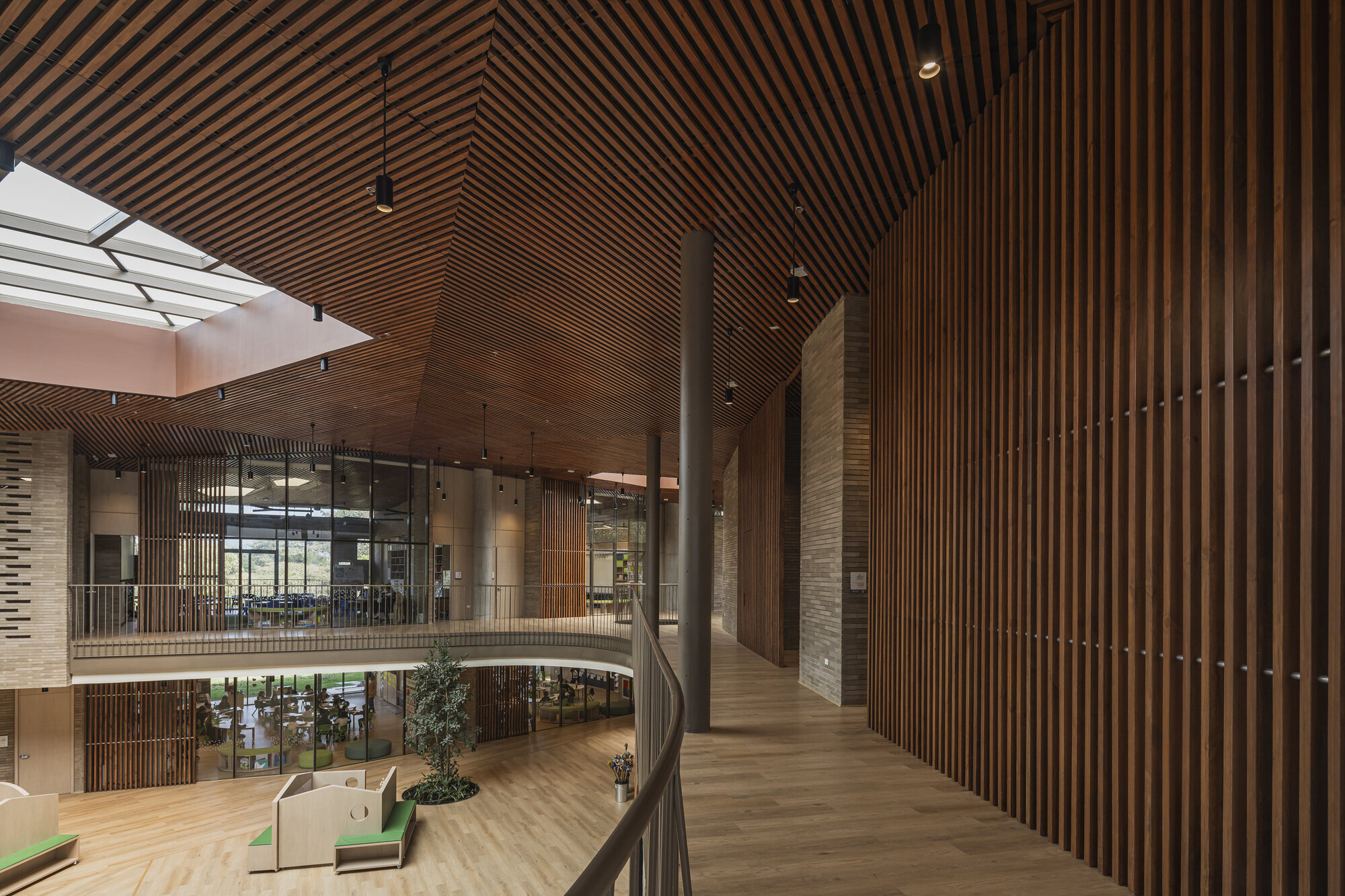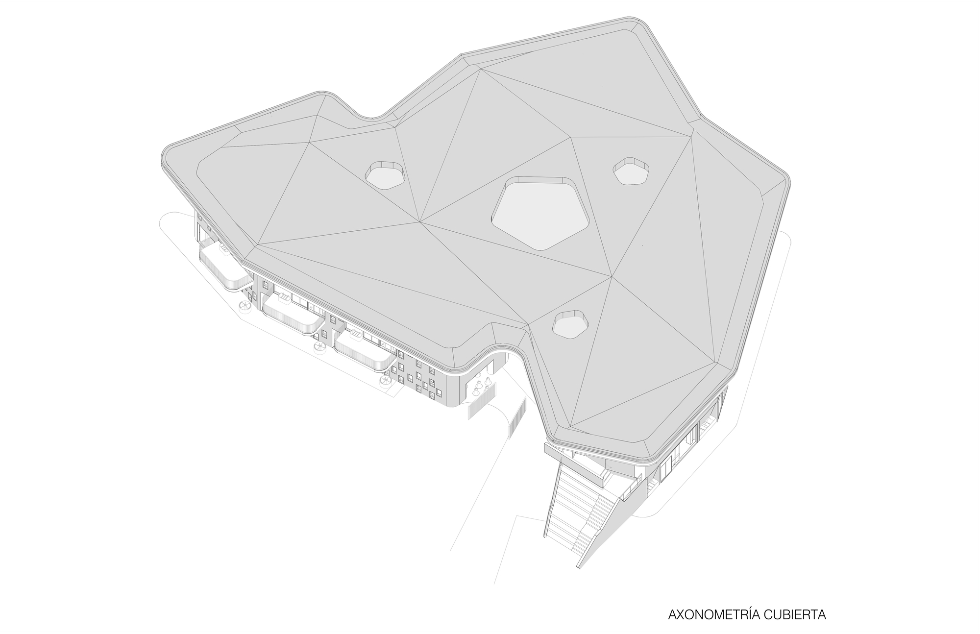 覆蓋在這三座量體之上的,是一片巨大的鋼筋混凝土構造折疊起伏屋頂,這片屋頂猶如一張被巨人之手精心摺疊的紙張,或是安地斯山脈連綿起伏的縮影,為下方的幼兒園、幼幼班及過渡班教室提供了庇護。