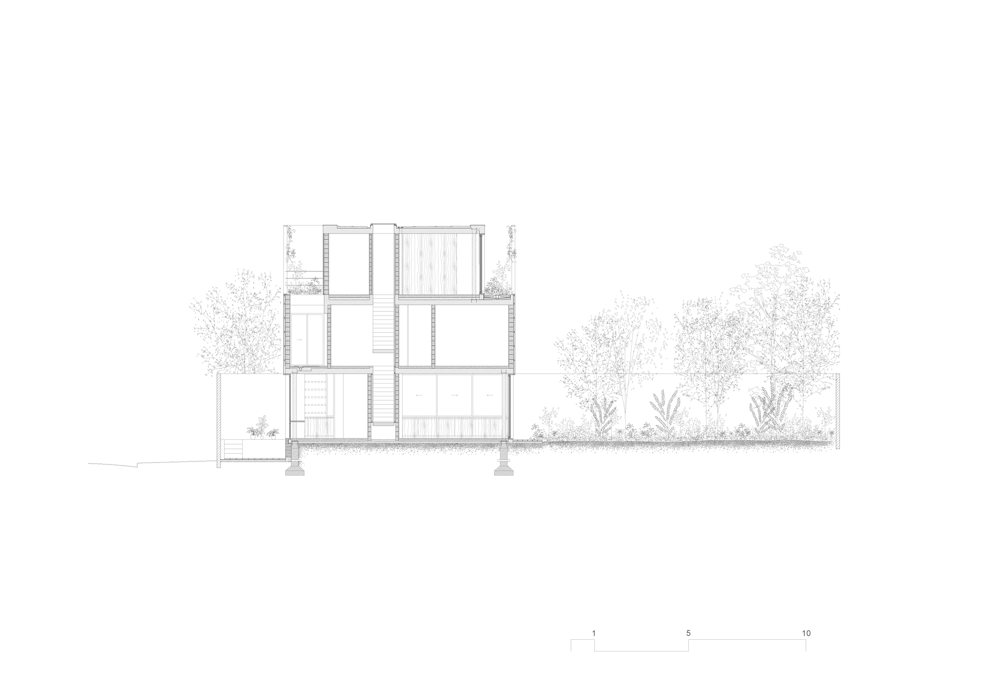 都會區住宅常因緊鄰相鄰地界線而顯得陰暗狹窄。設計團隊刻意讓建築物與兩側鄰房隔牆完全脫開,此項極具前瞻性的營建策略,確保居住環境維持均勻且一致的透明度。環繞四周的玻璃立面,使得屋內每一處角落皆能與戶外綠意產生深度對話。整幅樓層平面圖彷彿向外無限延伸,生活空間完全被私人花園的豐富層次所溫柔包覆。視線所及之處滿是生機盎然的自然紋理,讓人清楚看出建築師企圖打破傳統都市居住框架的雄心壯志。若未來有增建需求,此種獨立結構亦能提供極大彈性。