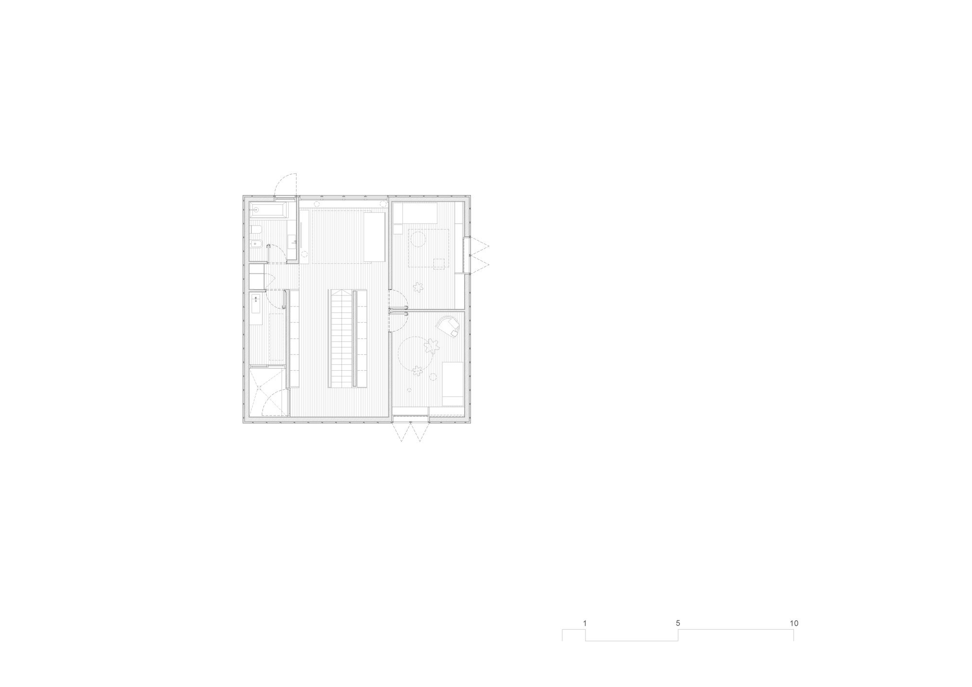 室內與戶外的連結,開始仰賴基地內既有老樹的巨大樹冠層來支撐。隨風搖曳的茂密枝葉宛如天然遮陽簾,不斷撥弄著灑入房內的陽光。光影在木造紋理上跳躍,靈活調節各個房間的明亮度與透明度,反映出兼具避世寧靜與動態變化的宜人居住氛圍。