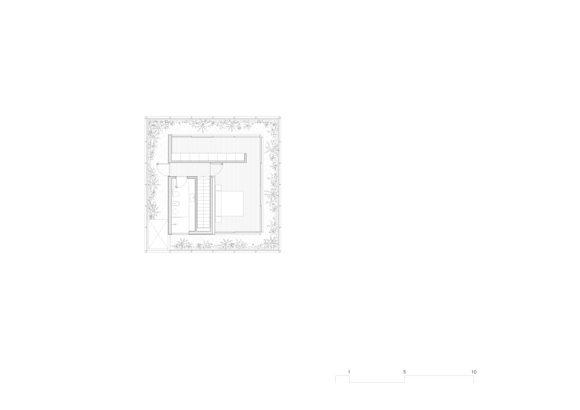 攀登至住宅的最高樓層,整體量體結構在此處進行徹底的去物質化處理。四周環繞的清透玻璃周界,再度讓庭院植被成為主導空間靈魂的核心主角。繁盛綠意從退縮的露台表面向外蔓延,消除室內外分野。