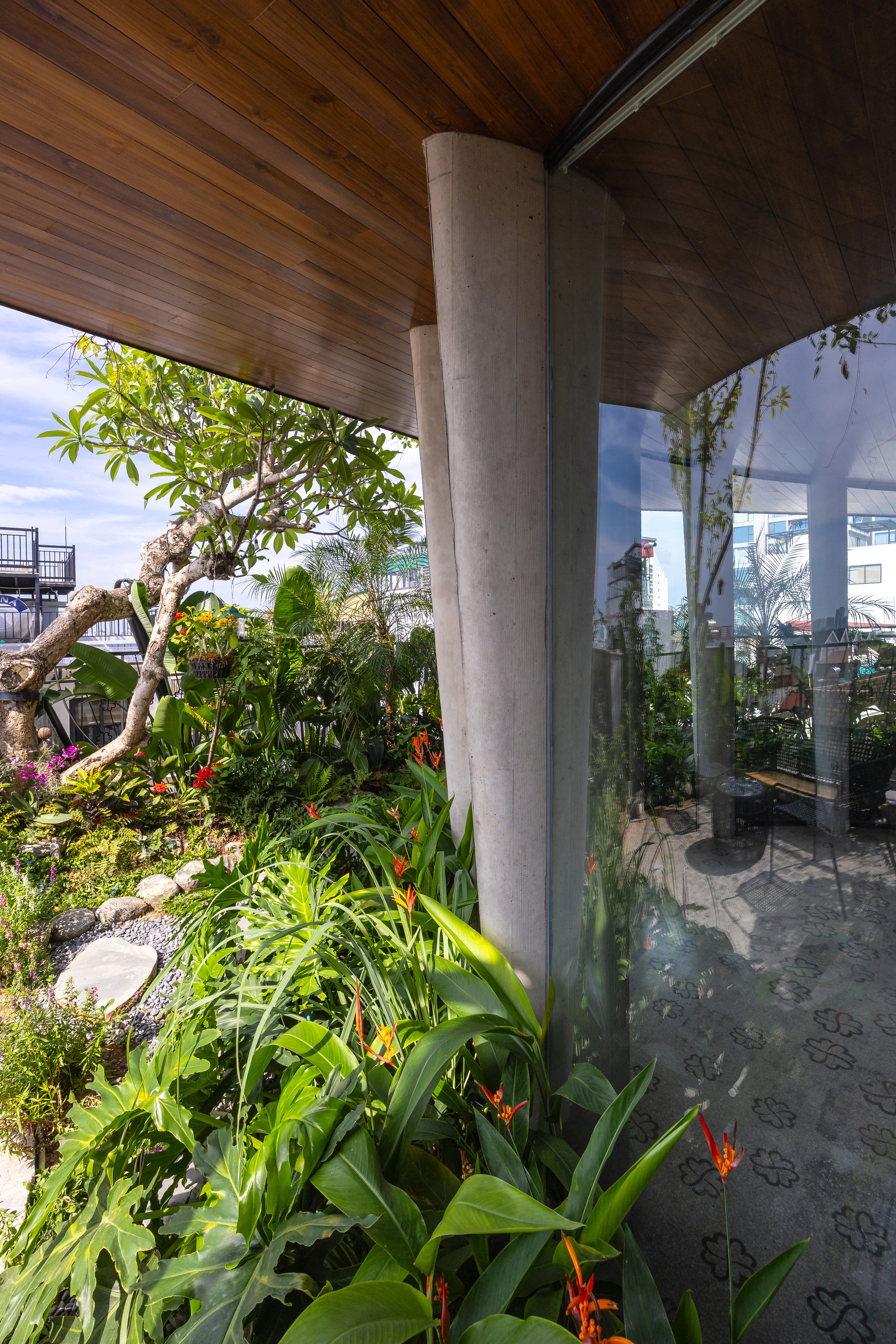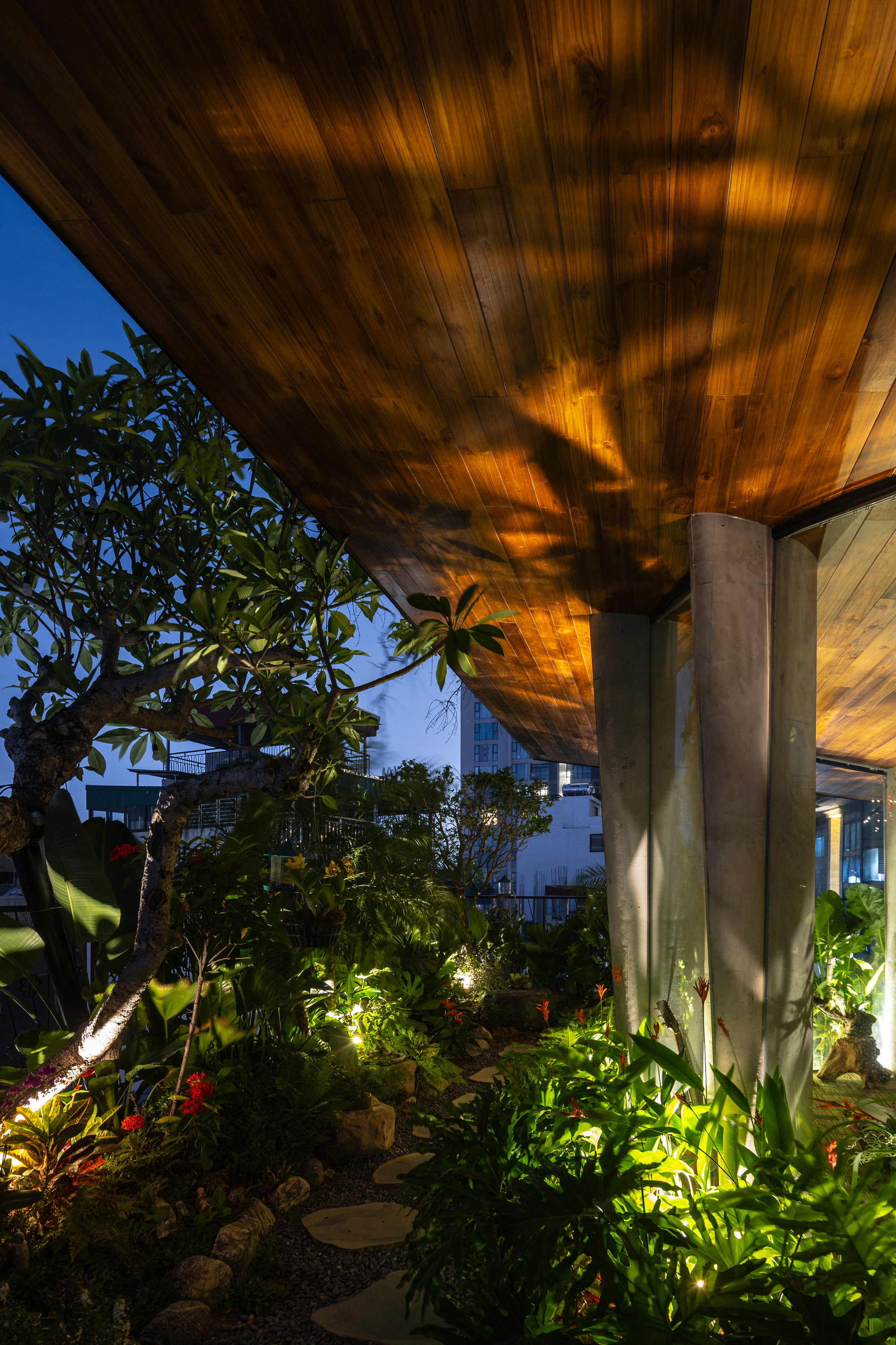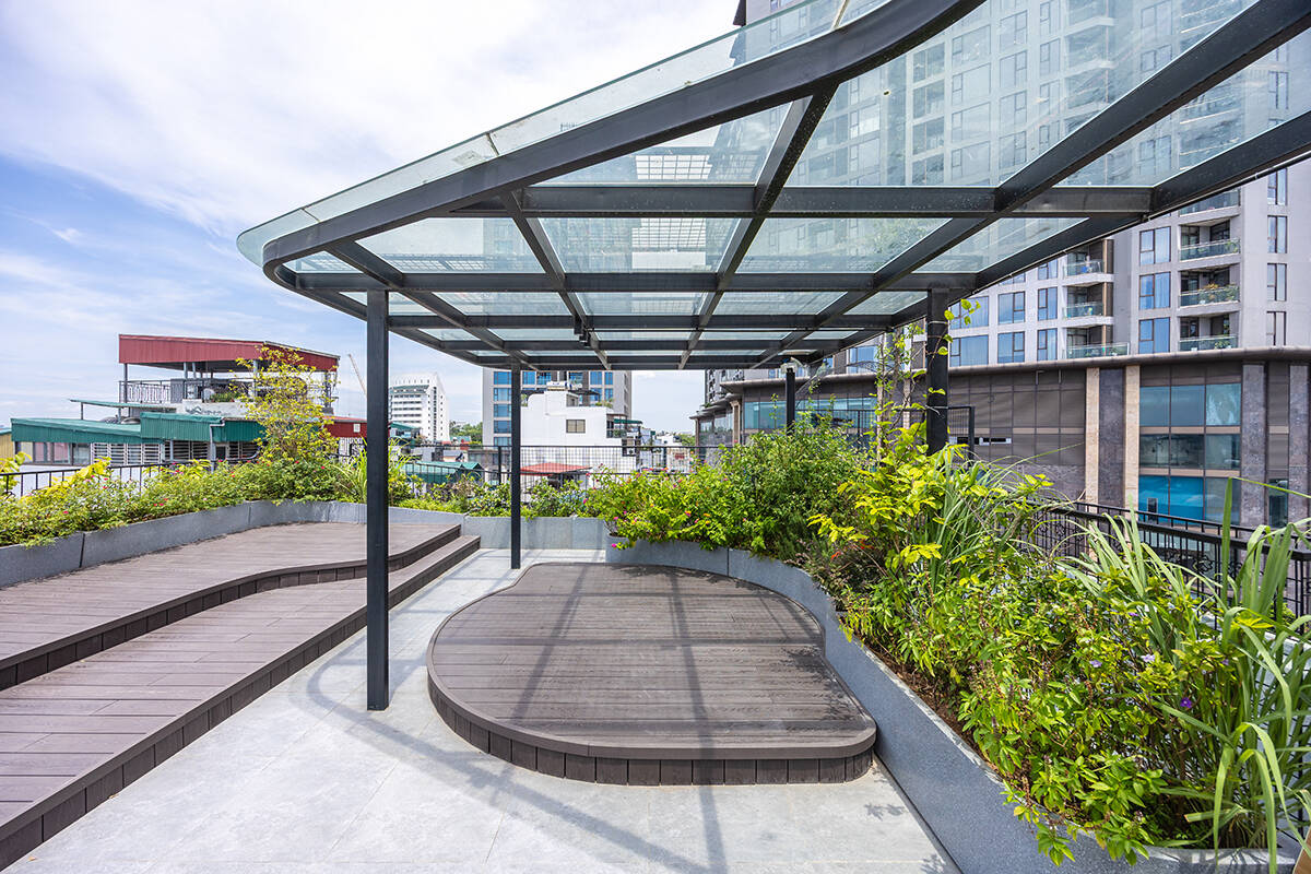LYM SPACE的營造選擇了整體澆置的清水混凝土作為主調,這種材料的原始與粗獷,恰恰突顯了其真實而不加修飾的本質。結合了石頭與木材等天然素材,冷冽的混凝土被注入了一股鄉野般的溫潤暖意,強化了人與自然之間的連結。這座建築物最終成為了河內街景中一個獨樹一幟的存在,它像是一處垂直的綠洲,在灰色的水泥叢林中編織出一抹生機。它不僅改善了微氣候,豐富了都市景觀,更像是一種精神喊話,激發著城市中人們積極向上的精神,證明了建築在功能之外,亦能成為撫慰人心的力量。