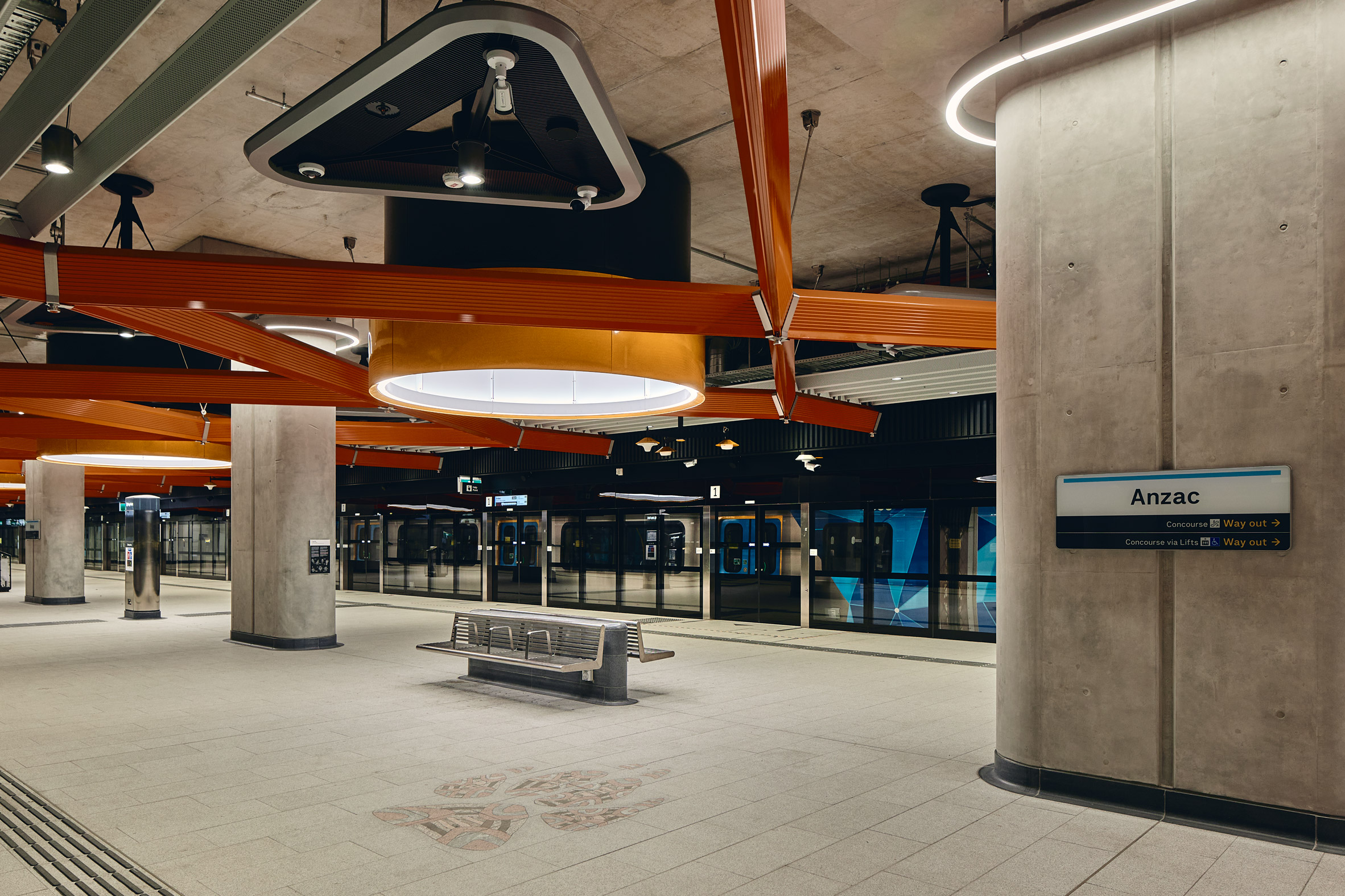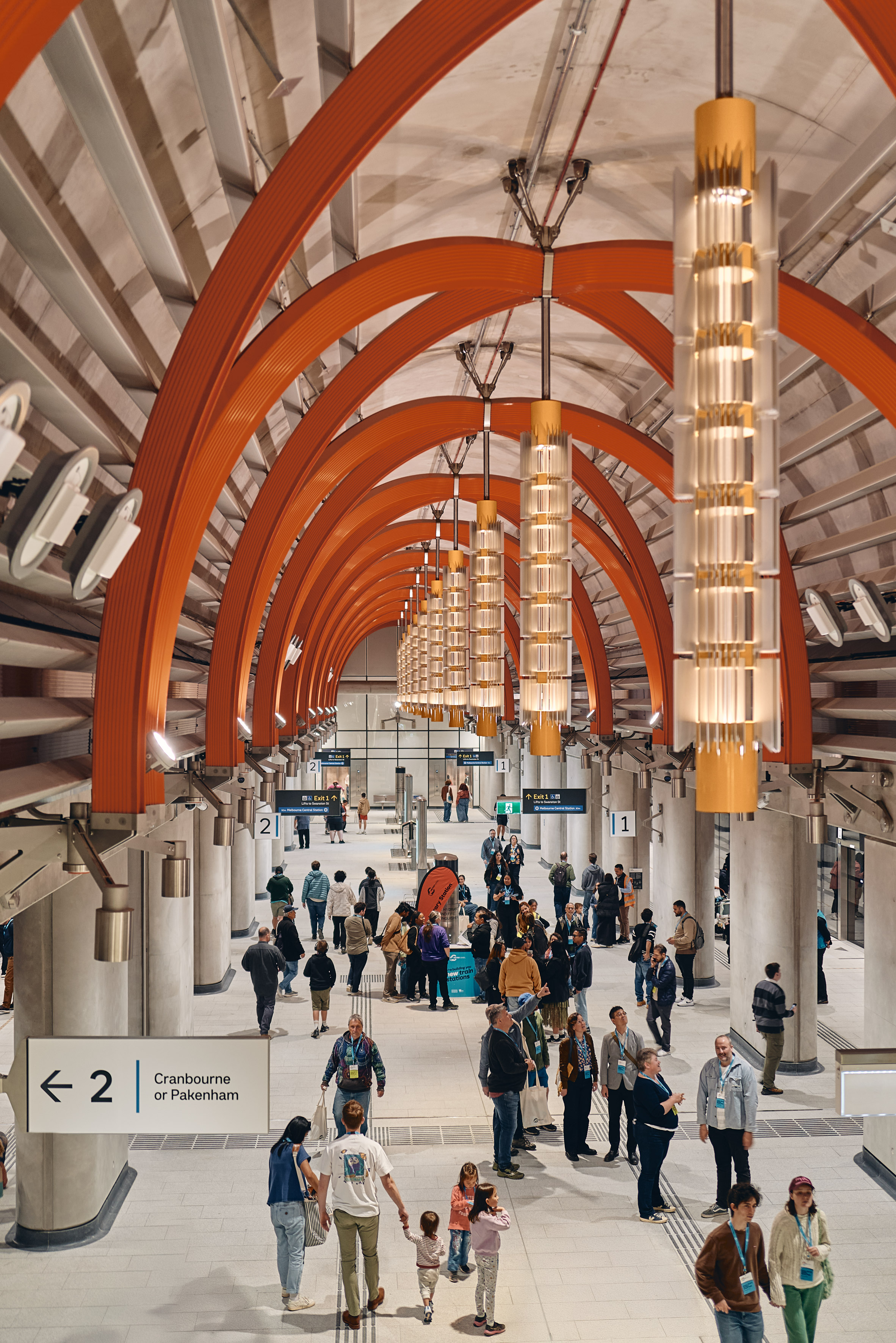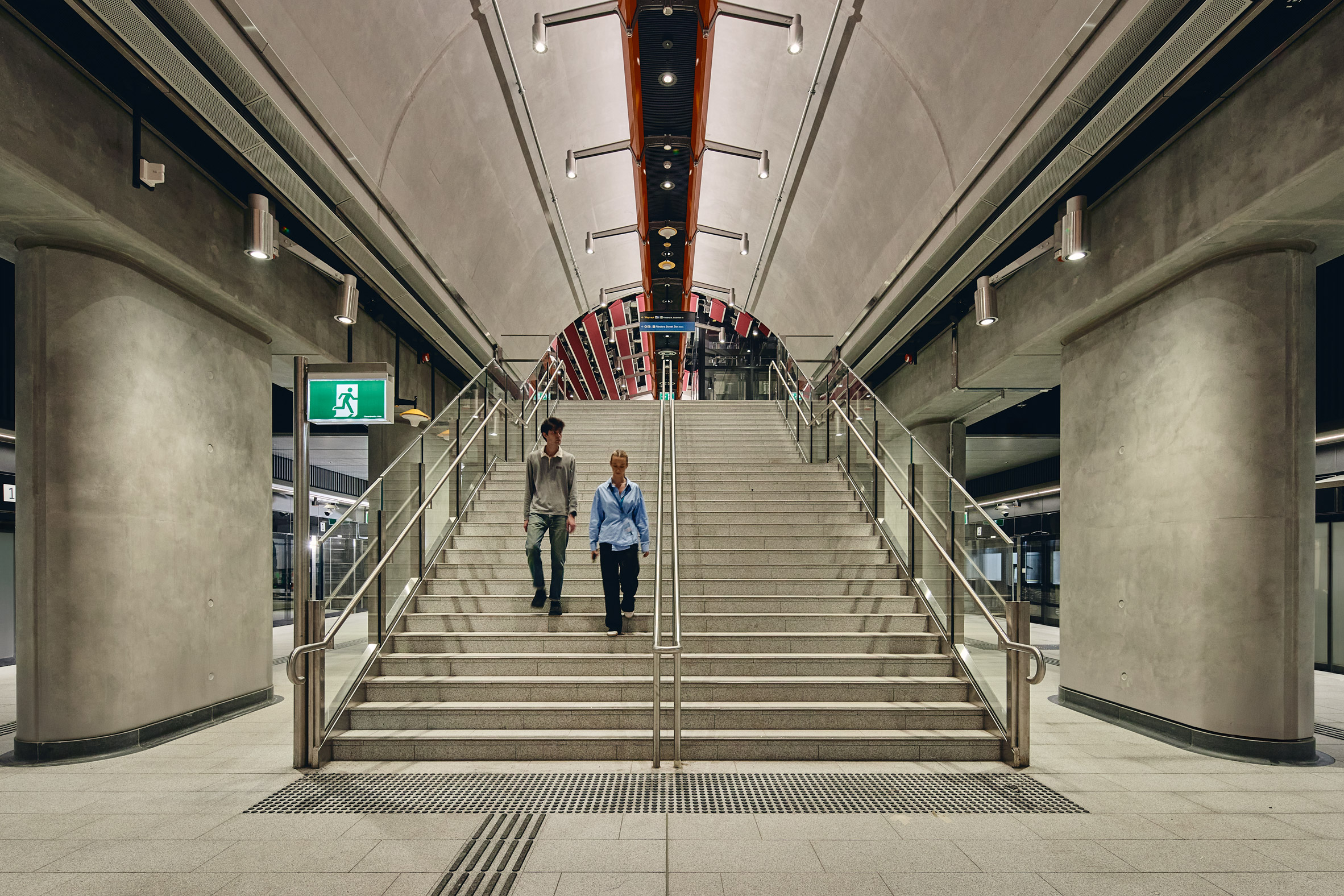 在 Town Hall Station,巨大的樹狀柱列撐起屋頂,象徵著城市生生不息的活力;而 State Library Station 則在厚實的混凝土柱之間嵌入了藝術面板,讓通勤者在移動間也能感受到濃厚的文化氣息。哈伯形容這些車站如同「兄弟姊妹」,性格各異卻血脈相連。每一個戲劇性地從地底浮現的入口,都是一個精心策畫的「城市門戶」,它們不僅引導著光線與人流,更在熙來攘往的街道上創造出新的停留點與會面處,深刻地重塑了墨爾本市中心的公共空間品質與都市生活的節奏。