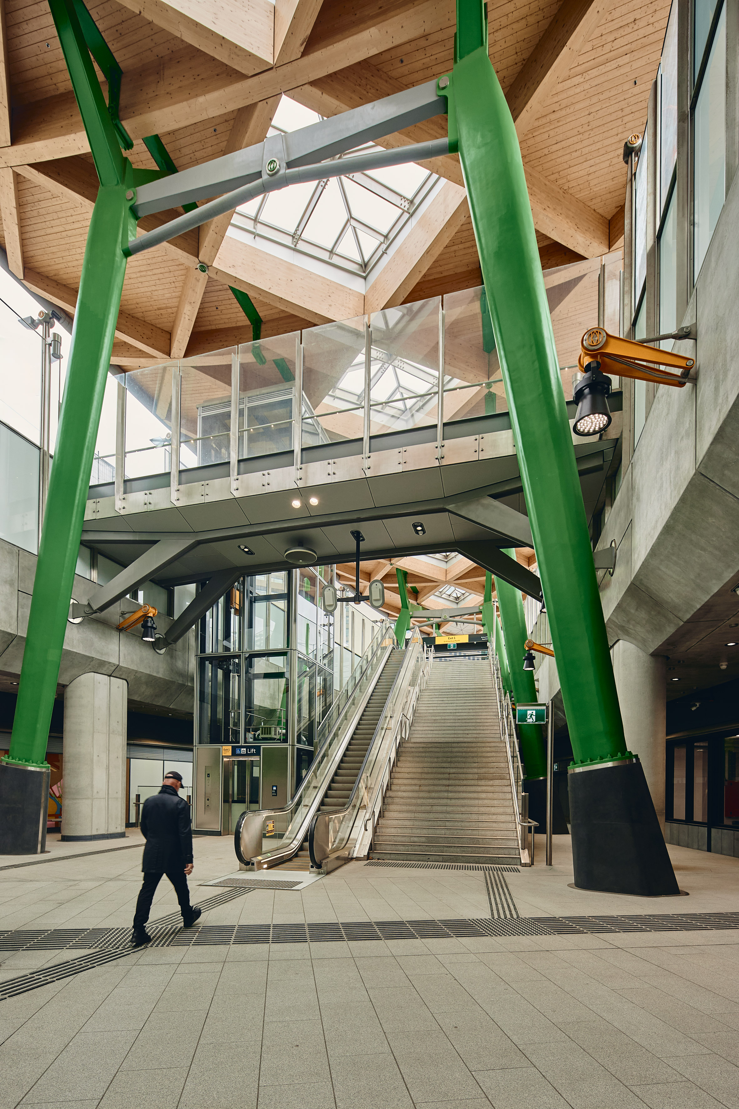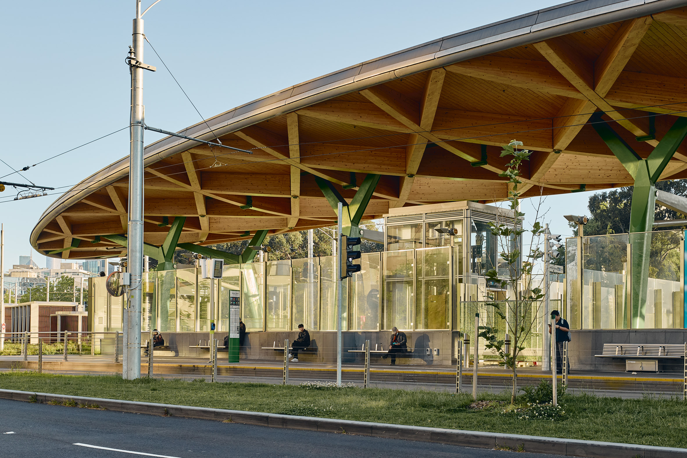 而在緊鄰皇家植物園(Royal Botanic Gardens)與聖基爾達路(St Kilda Road)的 Anzac Station,設計團隊巧妙地模糊了建築與景觀的界線,利用一系列綠色立柱支撐起溫潤的木質天篷(Timber Canopy),彷彿將公園的綠意盎然延伸至地下月台。這些車站不再是孤立的交通節點,而是透過精心設計的地面入口,與周遭的街道景觀無縫接軌,成為強化社區認同的重要地標。