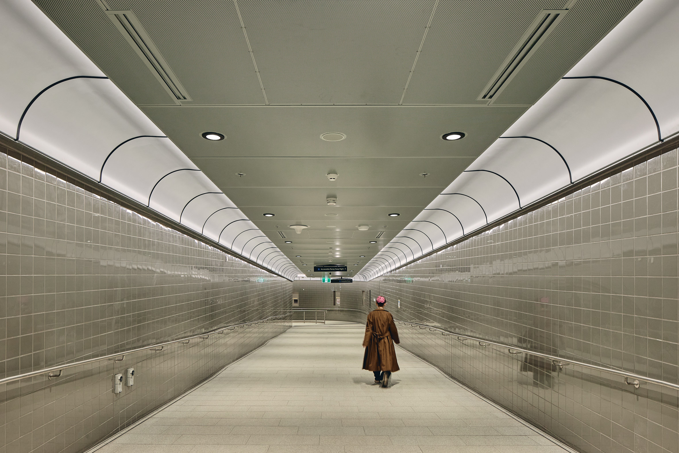 為了打破地下鐵路常見的幽閉感,建築師運用鮮明的色彩結構與充滿雕塑感的人工照明系統,更極力將地面的自然天光引入地底深處。這種光線的流動不僅是指引方向的燈塔,更賦予了空間隨時間推移而變化的生命力。正如哈伯所言,這些精密設計的人本尺度組件,與宏大的土木結構形成對比,構築出一種寬鬆而包容的空間定義,能夠在不破壞現有空間品質的前提下,從容吸納未來科技的演進。