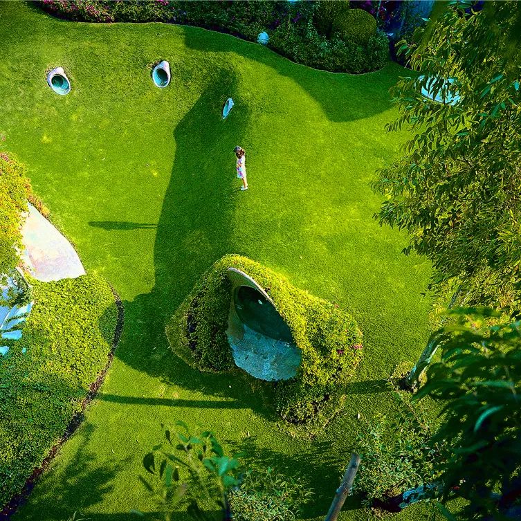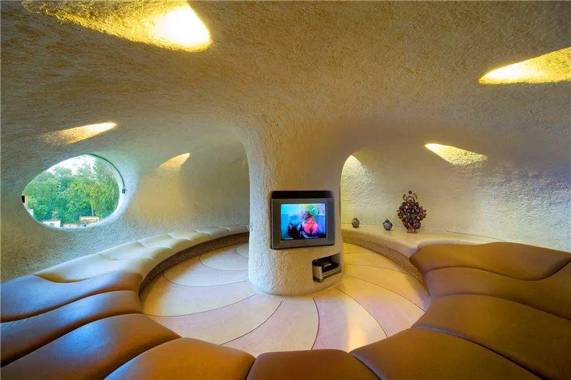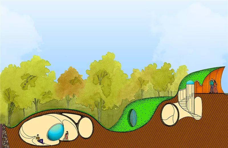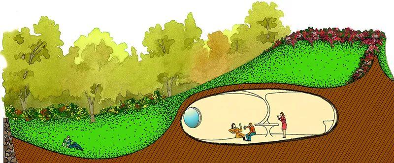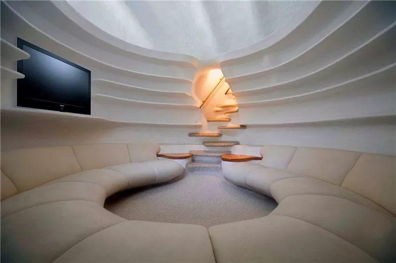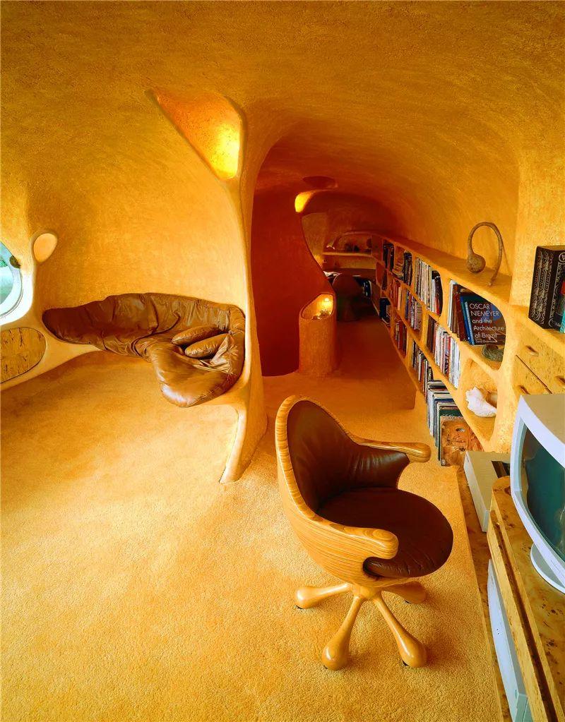 這種形體自由的半地下住宅,就像早期人類或動物的庇護所一樣,利用洞穴而不改變環境,建造一個像母親懷抱一樣溫暖的避難空間。