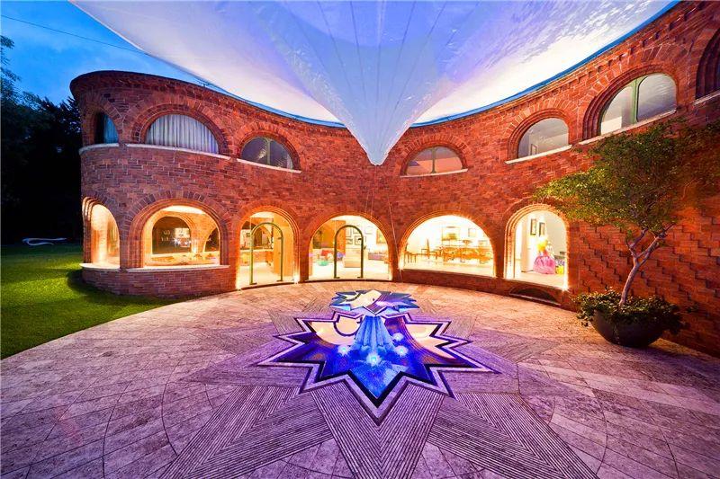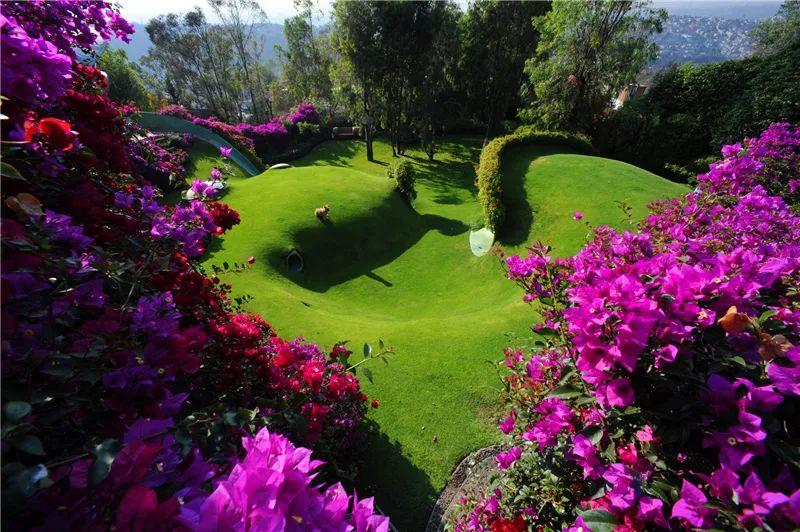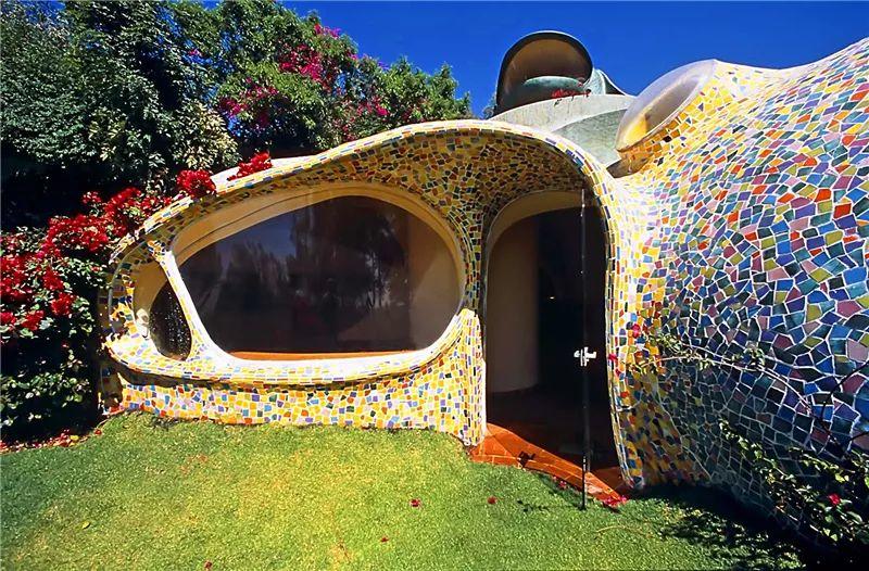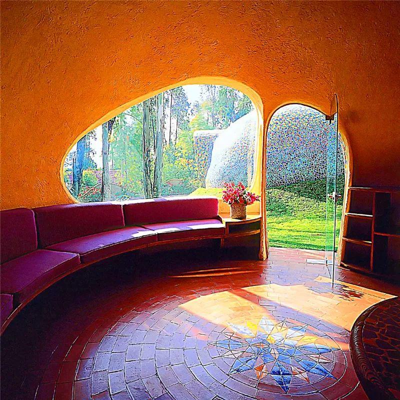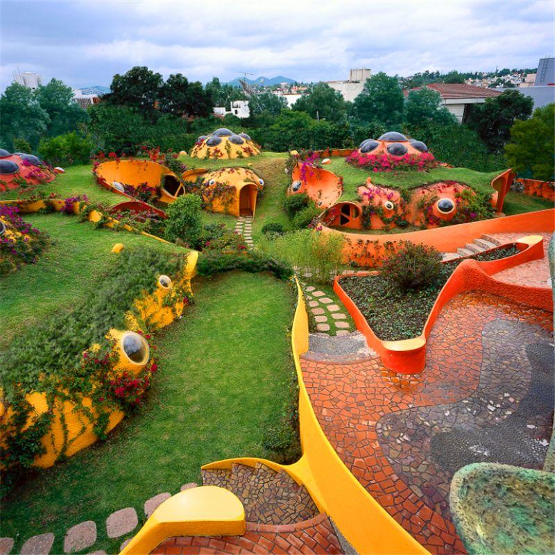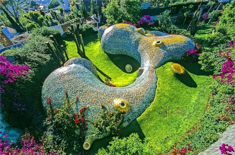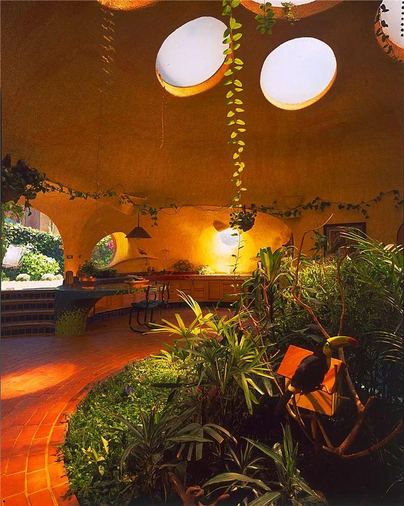1994年Casa Flor花屋,房子類似於六瓣花,花冠由釉面磚形成,建築內部圓頂上同樣是由彩色玻璃鋪嵌成的璀璨星空。