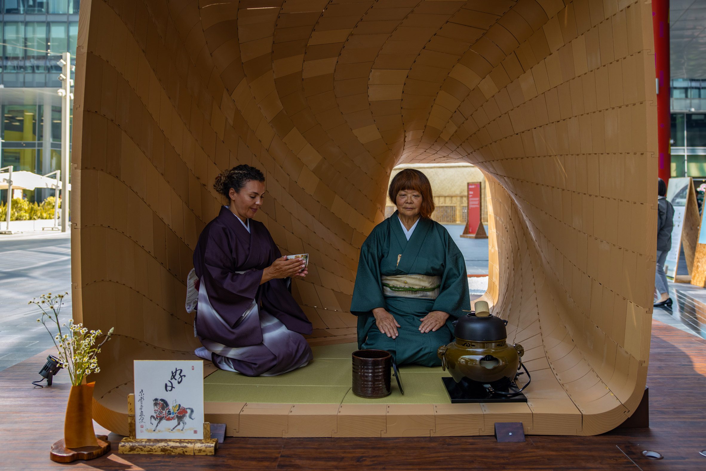 The Warp 茶室是三菱地所設計「Regenerative Wood(再生木材)」計畫的最新成果。這項計畫,是利用直交式集成板材(Cross-laminated timber, CLT)生產過程中產生的木屑,混合生物塑膠,製成 3D 列印的建築材料,用於建造房屋和家具。