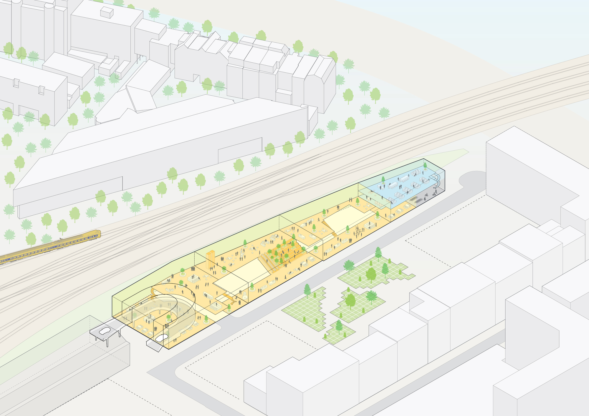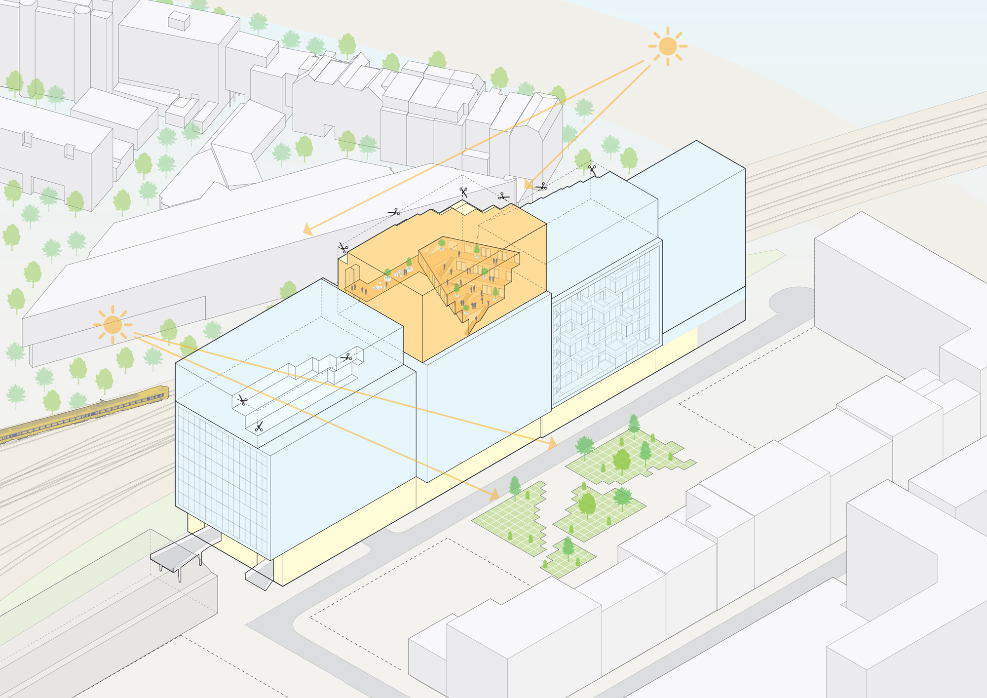 這些綠色空間不僅為高密度城市提供了喘息的機會,更透過精確的日照分析進行量體切削,避免對鐵路對面的住宅造成陰影遮擋。