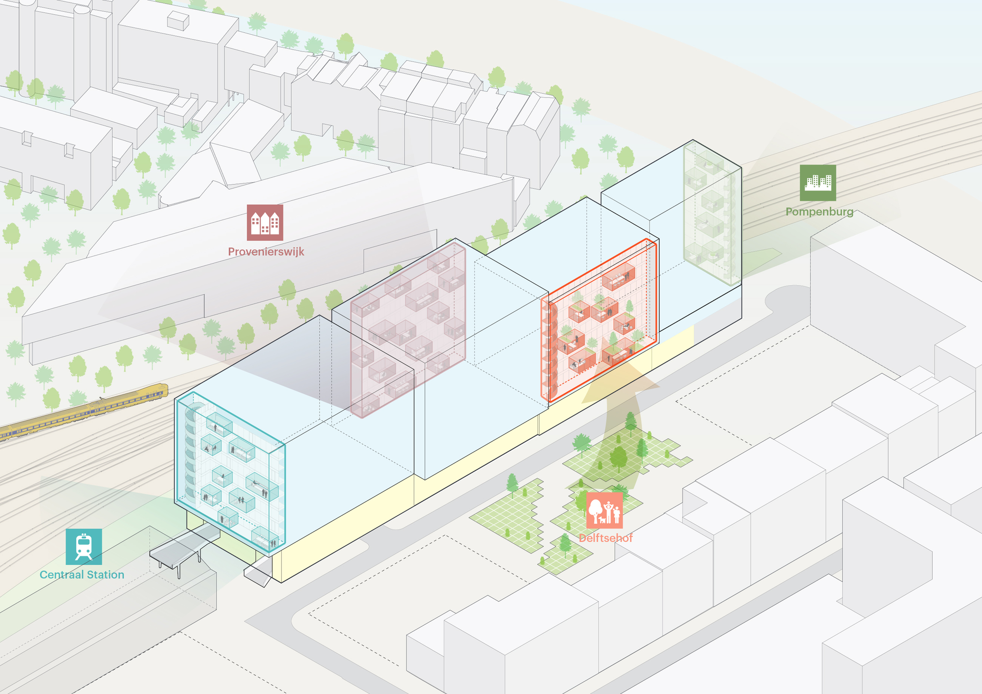 Schieblocks 以明亮且多樣化的姿態,向搭乘火車抵達鹿特丹的旅客宣告:這就是這座城市的未來面貌。