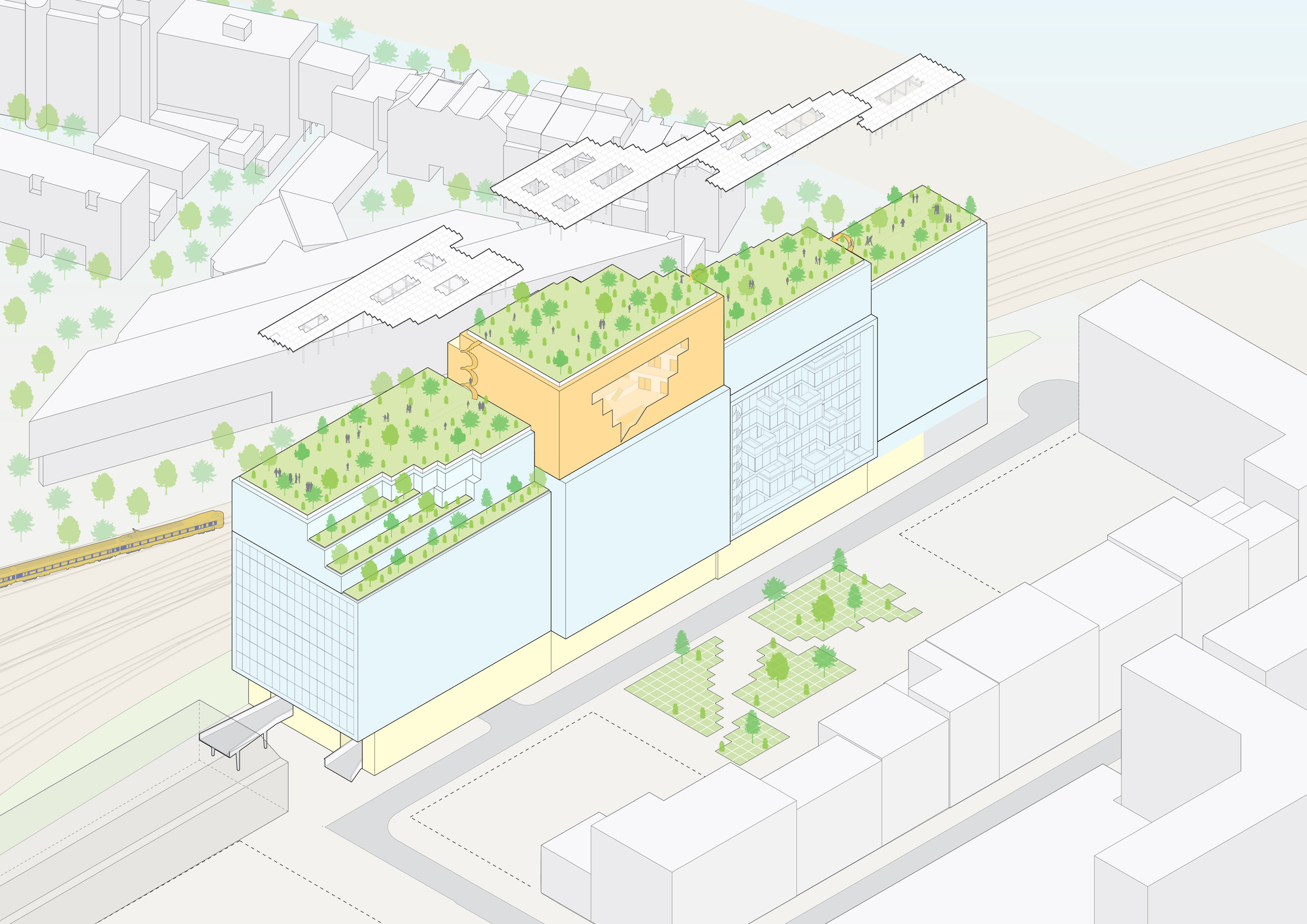 面對沿著鐵路線延伸、寬度受限的狹長基地,建築師並未選擇單調的板狀設計,而是將這座長達150米、高61米的建築,構想為一個垂直發展的「立體鄰里」。