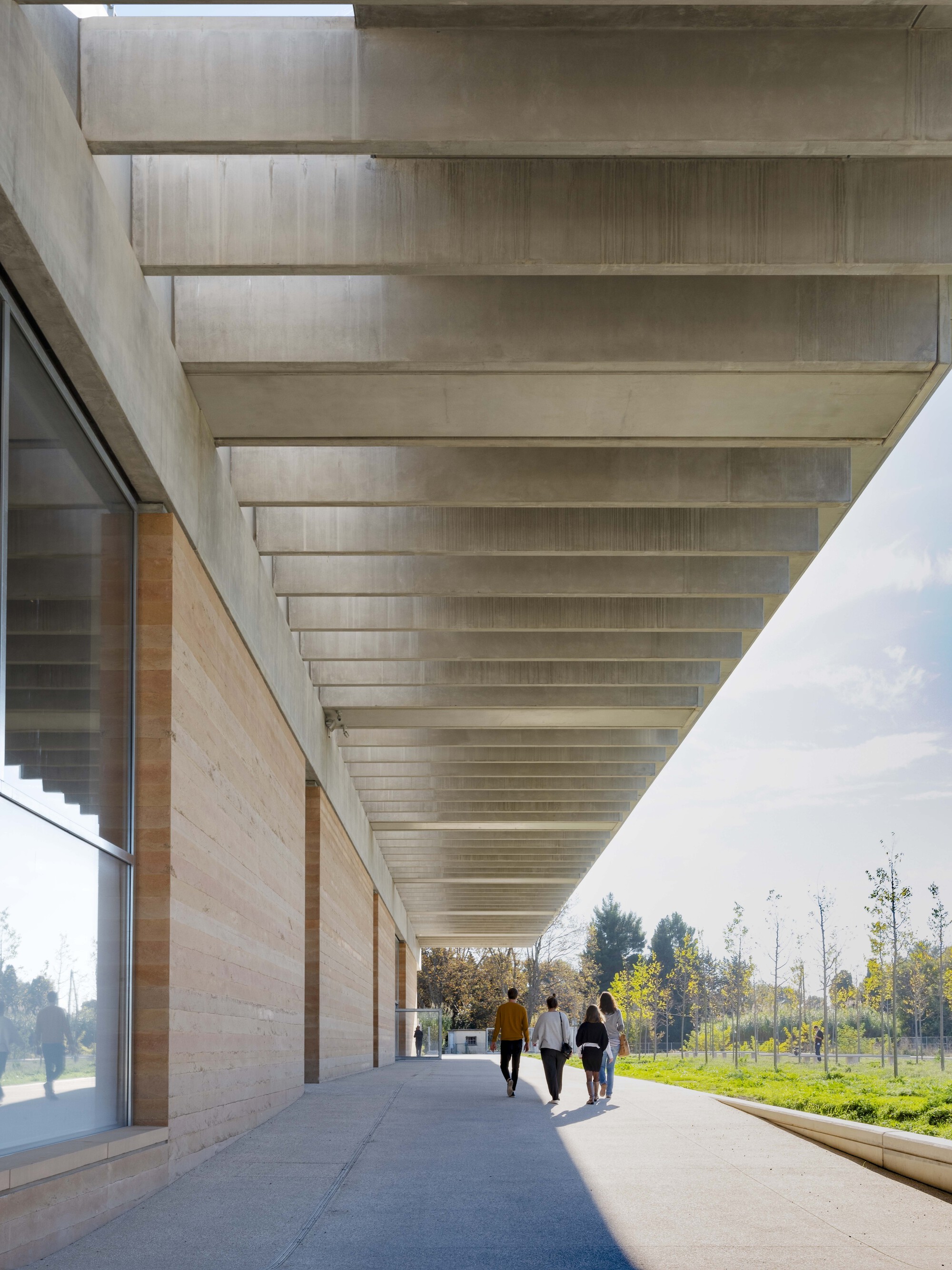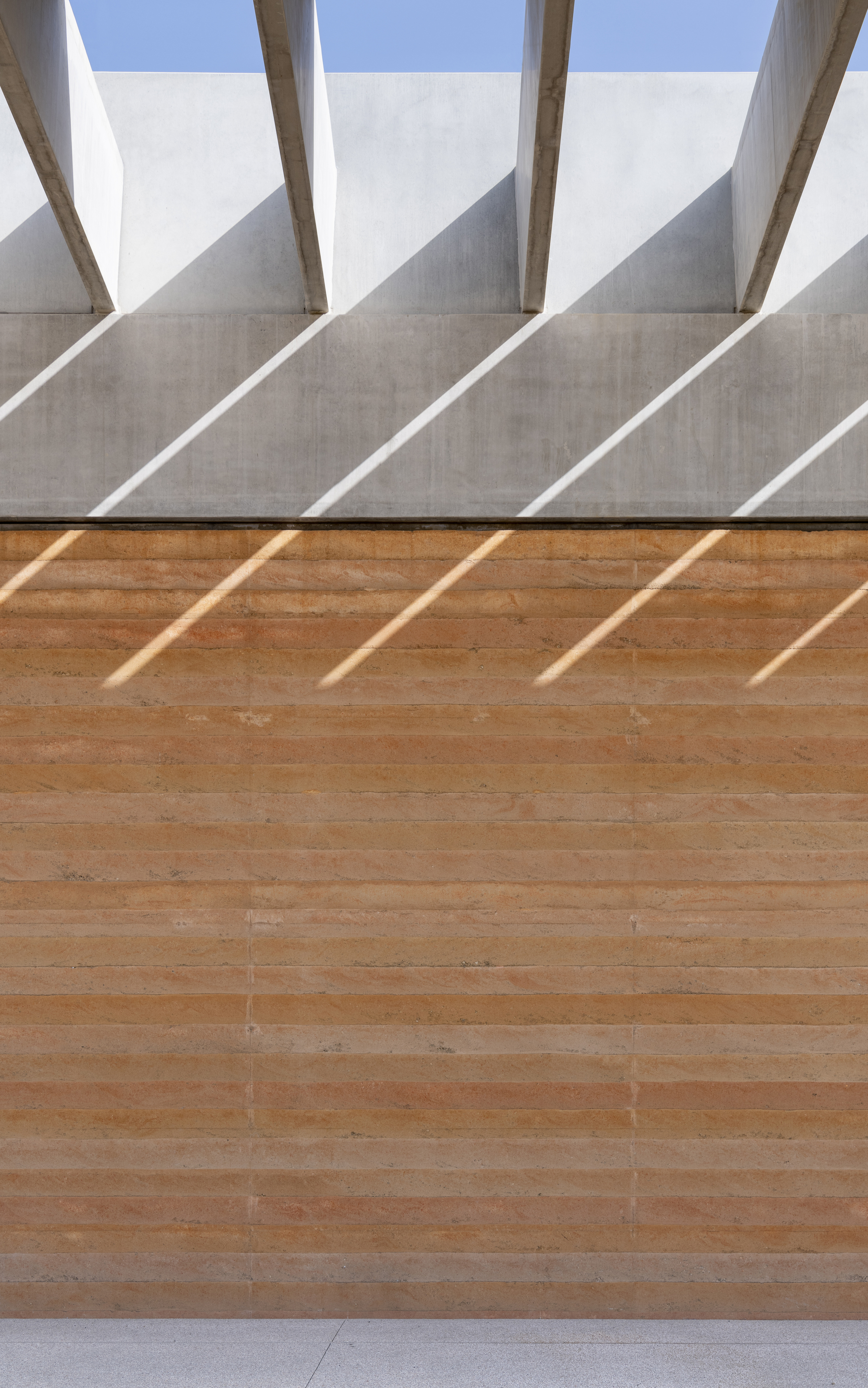 博物館的空間在一體成形的混凝土屋頂棚蓋下整合,提供了重要的熱質量,也是整體環境策略的重要環節。屋簷高於天窗之上,其間點綴著採光井,並延伸出環繞博物館步道的涼棚。在結構回應上,建築師秉持返璞歸真的理念,採用實心、隔熱且承重的牆體。這些牆體支撐著屋頂,主要的承重元件是鋼筋混凝土雙T樑,雙T樑跨越到一個鋼筋混凝土樑網格上,這種系統以極簡的原則確保了結構的堅固與施工的效率。