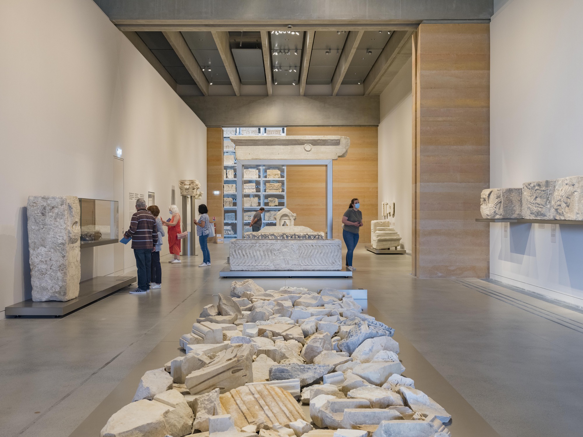 博物館的核心亮點,是一座名為「石刻牆」(Lapidary Wall)的裝置。這座牆位於博物館的心臟地帶,形成一處天然的邊界,將公眾展廳與相對私密的文物修復空間隔離開來。參觀者可以透過這面石頭與光線交織而成的馬賽克牆,一窺考古學家與研究人員的日常工作,將原本幕後的修復過程轉化為主動學習的教材。石刻牆具備高度彈性的展示框架,讓牆上的浮雕可以輕鬆地重新配置,成為隨時變動的教學工具。這種設計不僅解決了大量羅馬時代墓碑的存儲問題,更巧妙地將學術研究引入公眾視野。