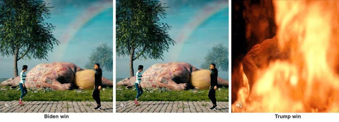 Beeple影片作品《十字路口》(Crossroad)有兩個版本,最終呈現是基於2020年美國總統大選結果,觸發兩個動畫的其中一個開始播放。