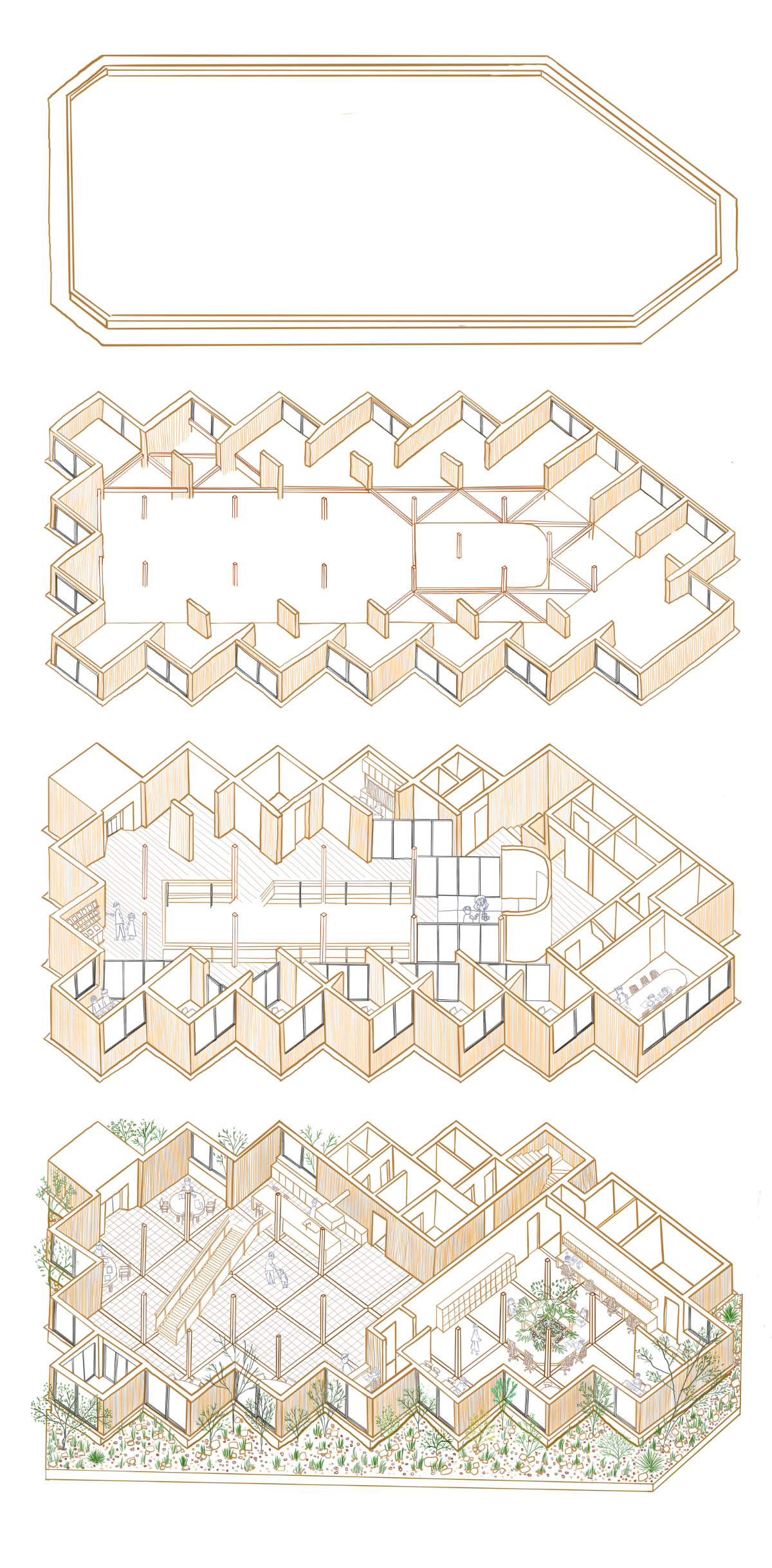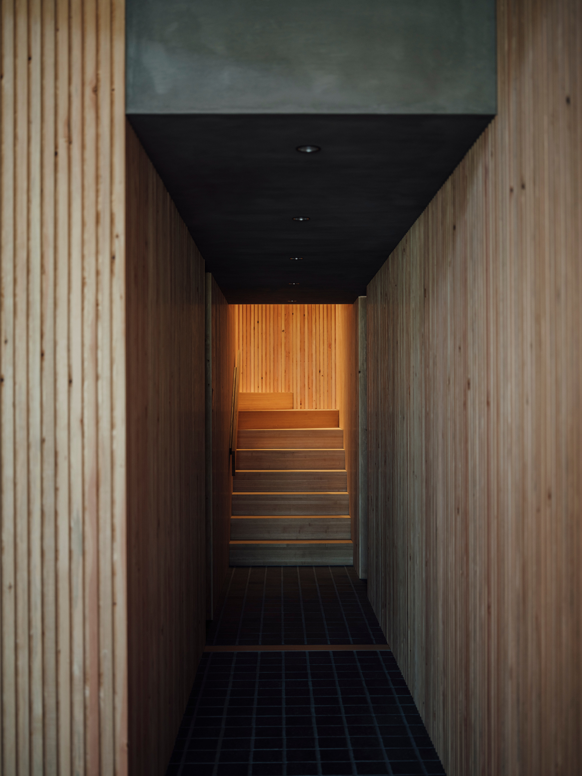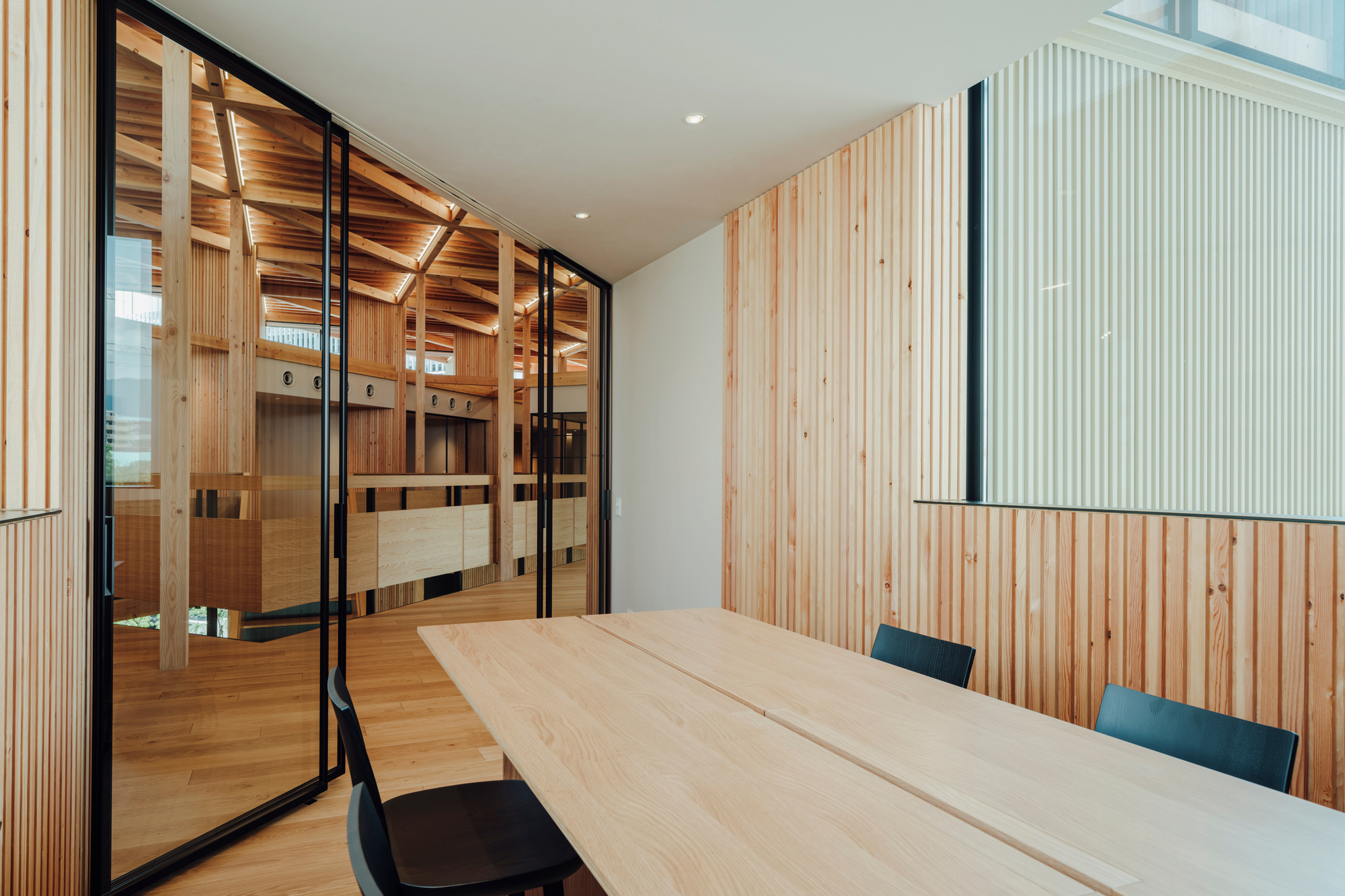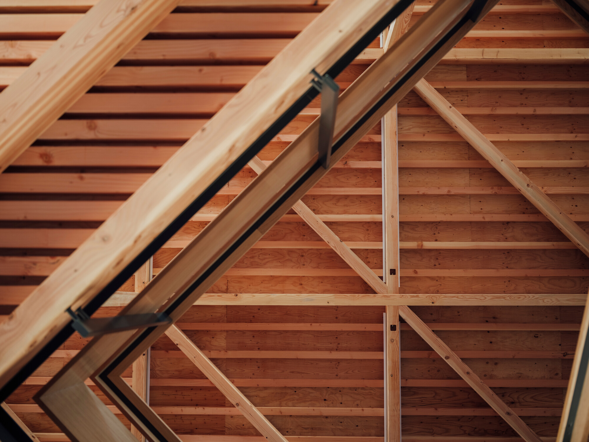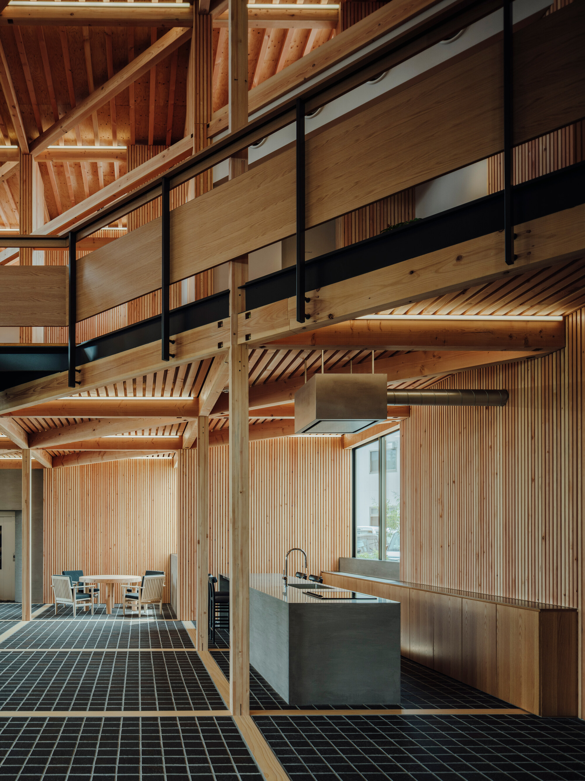 設計的另一個重點是將結構與裝修合而為一。建築師沒有用天花板或牆板把木頭骨架遮起來,而是讓原本的木造框架直接外露,變成室內表面。大家走進去,可以直接看到柱子、樑木與接頭的美感。